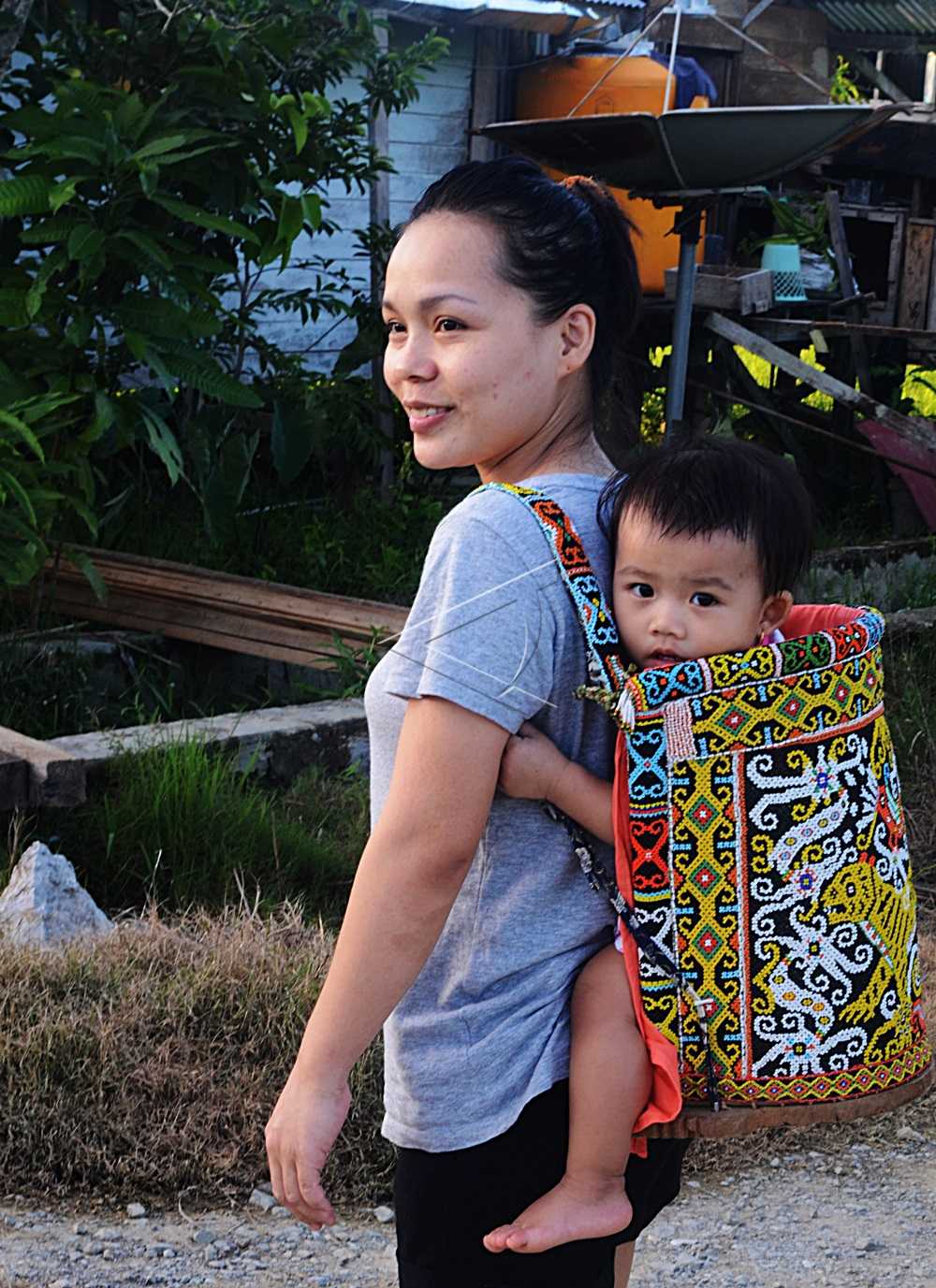 A mother carries her child using “Anyat”, a typical backpack of Dayak that full of colorful bead carvings in the Bulungan border region, North Kalimantan, December 22, 2014. ANTARA FOTO/Iskandar Zulkarnaen/mes/dw/nym.