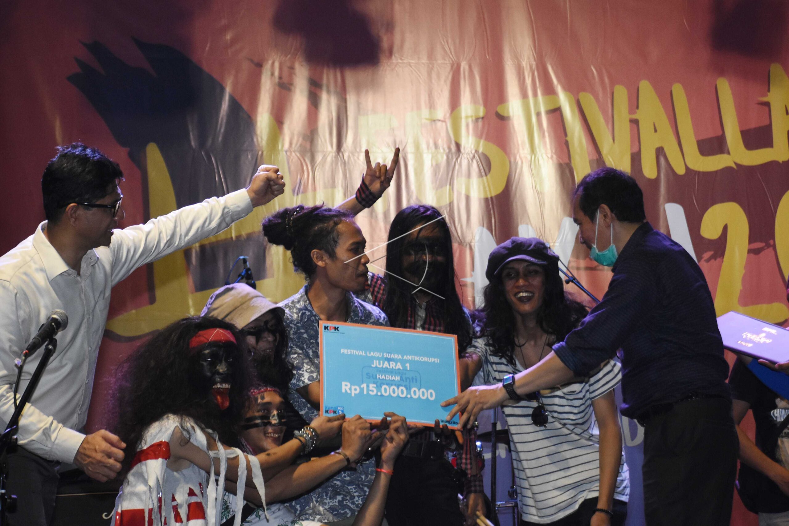 Vice of Chairman of the Corruption Eradication Commission (KPK) Saut Situmorang (right) and Laode Muhammad Syarif (left) hand over the prize to first winner of Anti-Corruption Song Festival, Band Akar, at Plaza Festival in Jakarta, November 30, 2018. ANTARA FOTO/Indrianto Eko Suwarso/kye/dw/wpa.