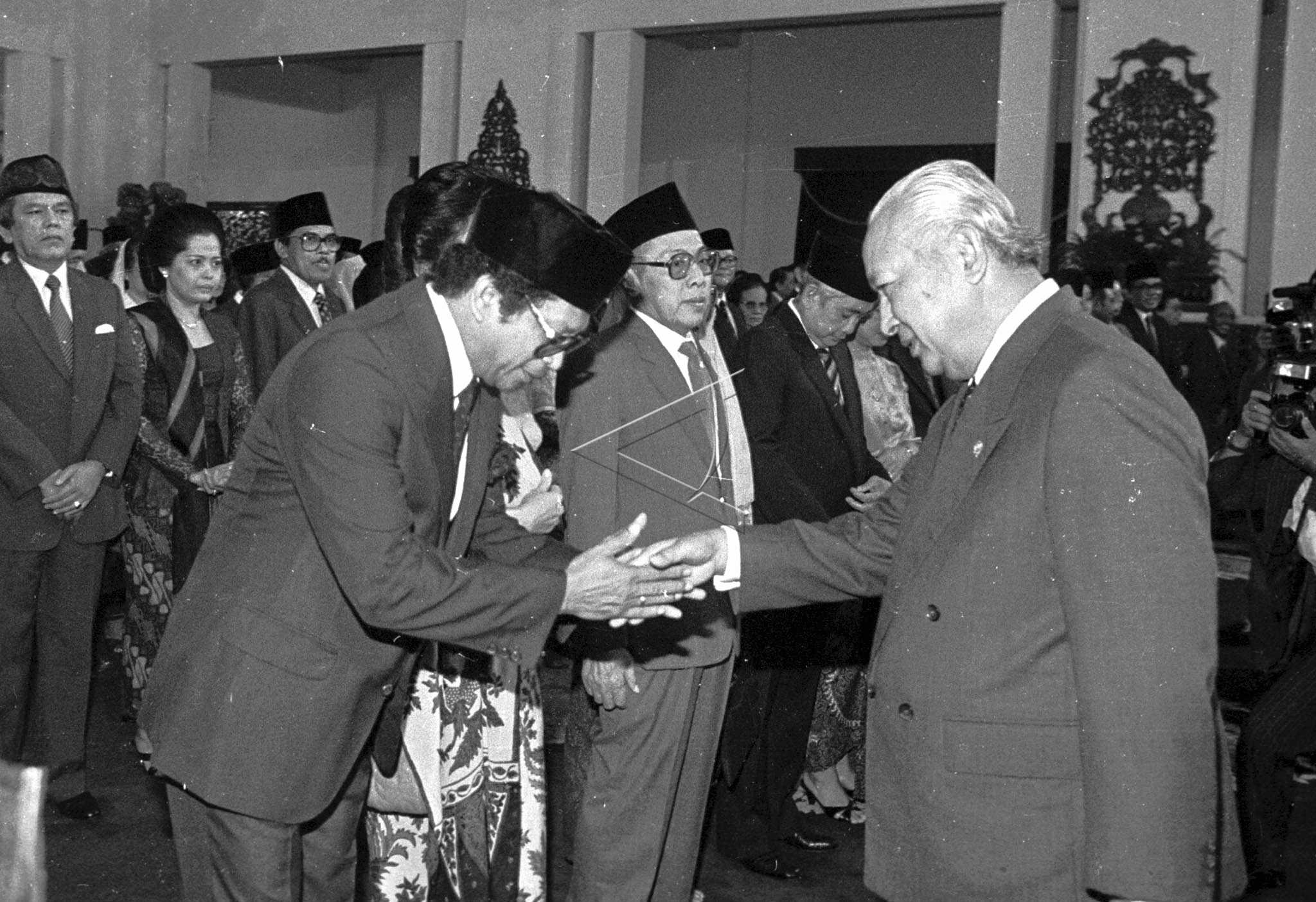 President Soeharto (right) shakes hands with former Minister of Youth and Sports Abdul Gafur (left) and members of the Supreme Advisory Council (DPA) after taking the oath and appointment of DPA members for the period 1988-1993 at State Palace, Jakarta, August 6, 1988. ANTARA FOTO/N04/N09/hm/asf/nym/sa.