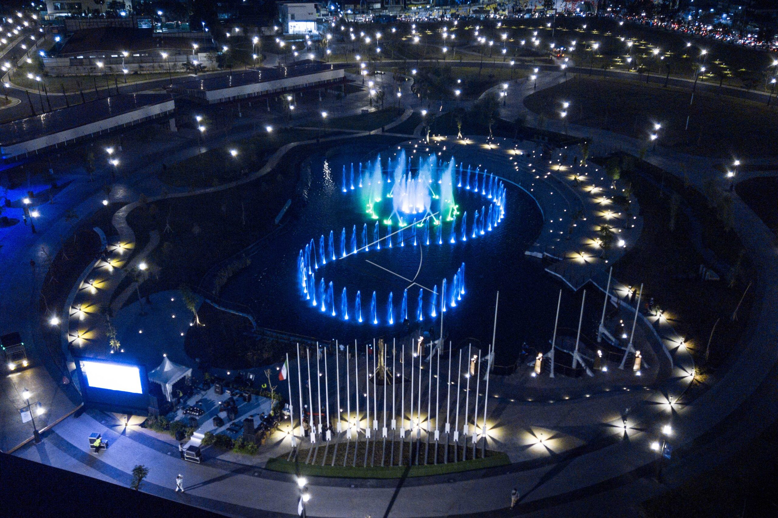 An aerial view shows a dancing water at Asia Africa Park in Kiara Artha Park, Bandung, West Java, June 29, 2019. ANTARA FOTO/Raisan Al Farisi/dw/tom/djo