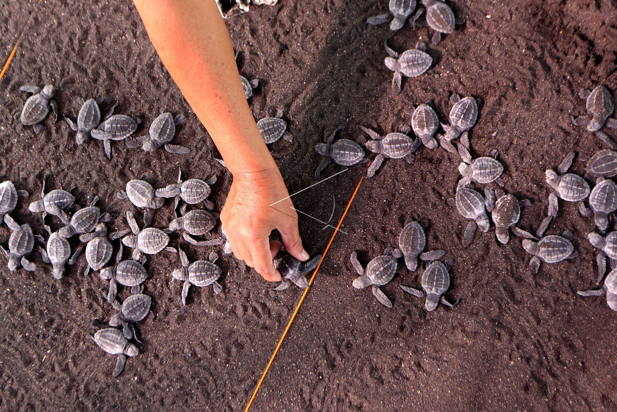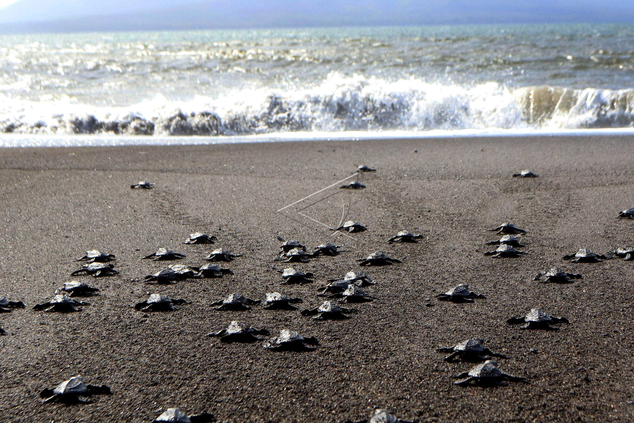 Numbers of baby sea turtles are hatchling at sea turtle eggs captivity in Boom Beach, Banyuwangi, East Java, June 1, 2019. ANTARA FOTO/Budi Candra Setya/dw/tom.