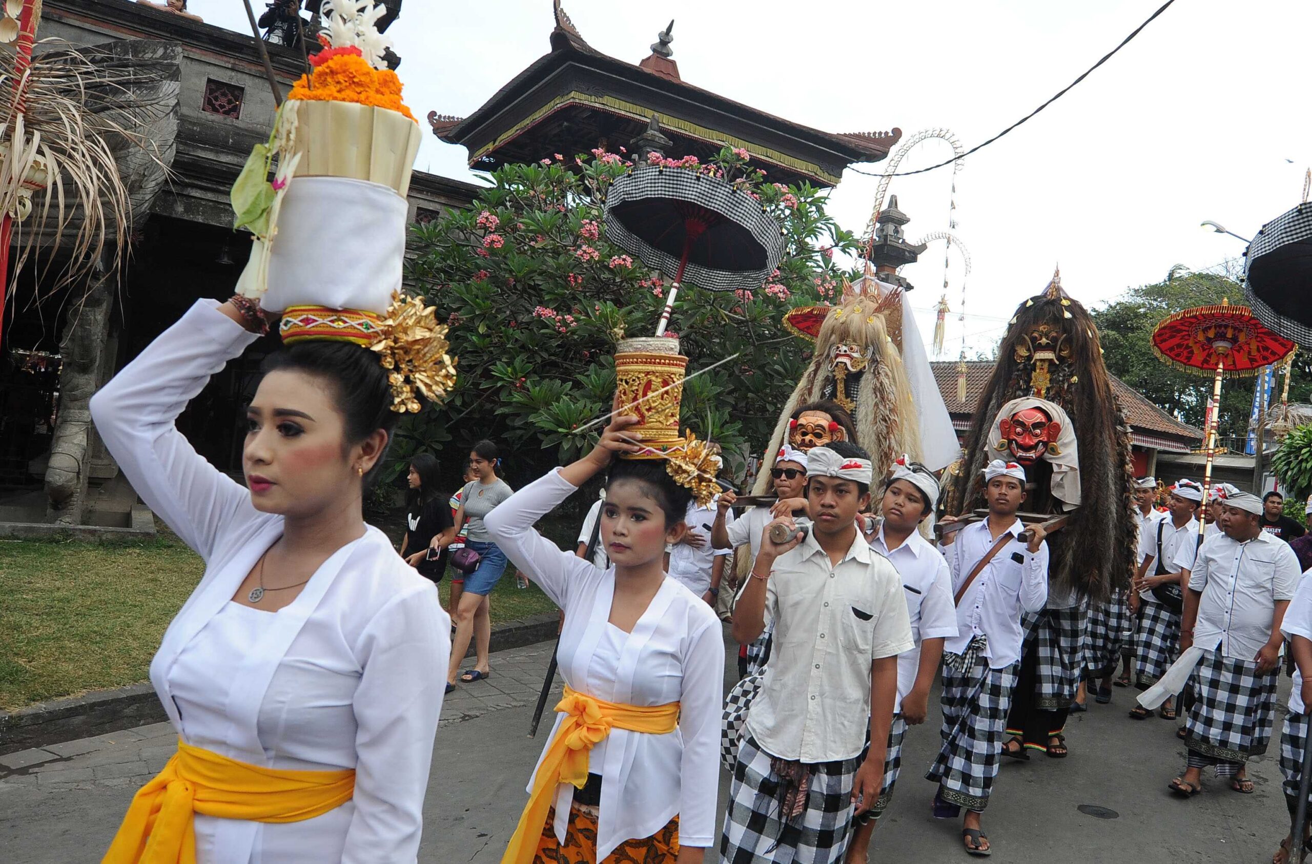 Members of Sanggar Manik Suara as Bangli Regency Arts Ambassador performs during the “Parade Ngelawang” as part of the 2019 Bali Arts Festival (PKB) at the Bali Cultural Park, Denpasar, Bali, July 3, 2019. ANTARA FOTO/Fikri Yusuf/foc/dw/nym.