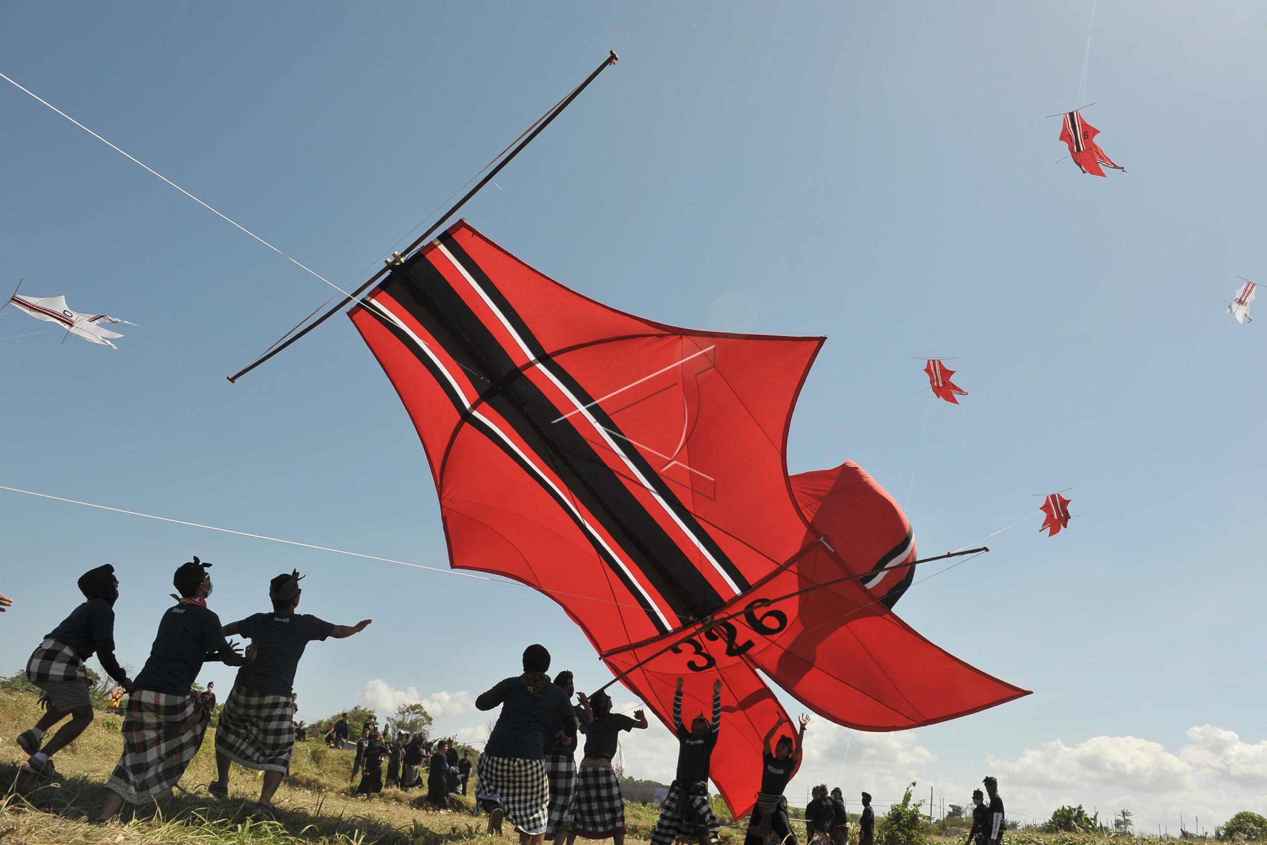 Participants fly fish-shape traditional kites during 37th Bali Kites Festival at Padanggalak Beach in Denpasar, Bali, July 3, 2015. ANTARA FOTO/Nyoman Budhiana/pd/dw/wpa.