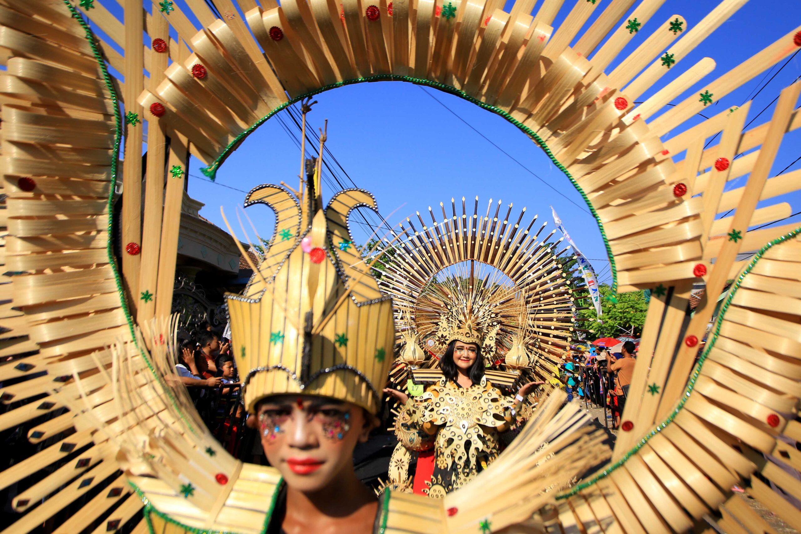 Models present ethnic costumes created by bamboo artists during Gintangan Bambu Festival in Banyuwangi, East Java, May 6, 2018. ANTARA FOTO/Budi Candra Setya/foc/dw/18.
