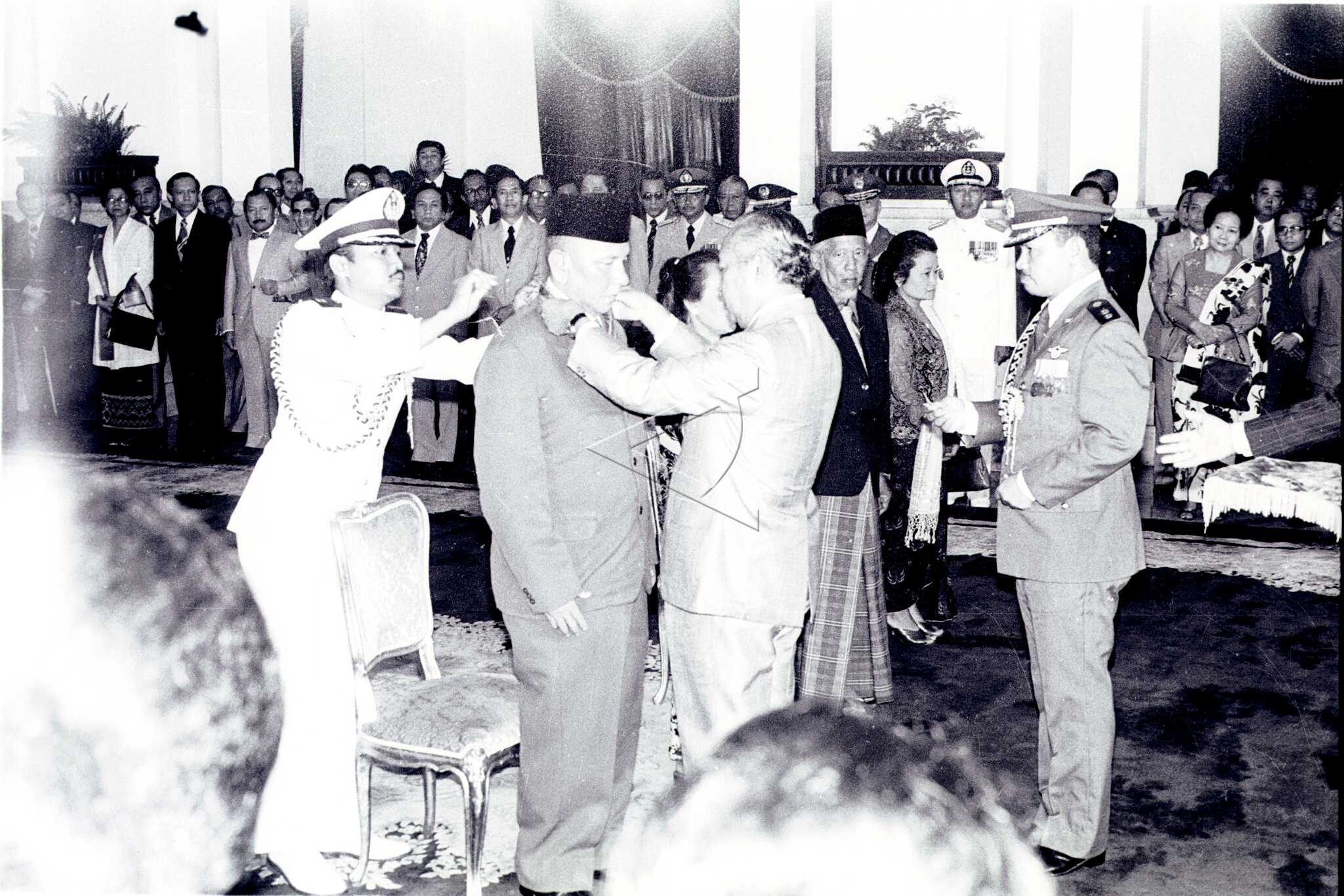 Indonesia’s President Soeharto (C) pin in the honorary star of service to Prof. Dr. Mustopo, Dr. Affandi, Prof. Dr. Ing. Josep Soenaryo and Soegondo respectively in the form of Bintang Jasa Putra Utama and Bintang Mahaputera Utama in commemoration of the 33rd Anniversary of Indonesian Independence at State Palace, in Jakarta, August 15, 1978. ANTARA […]