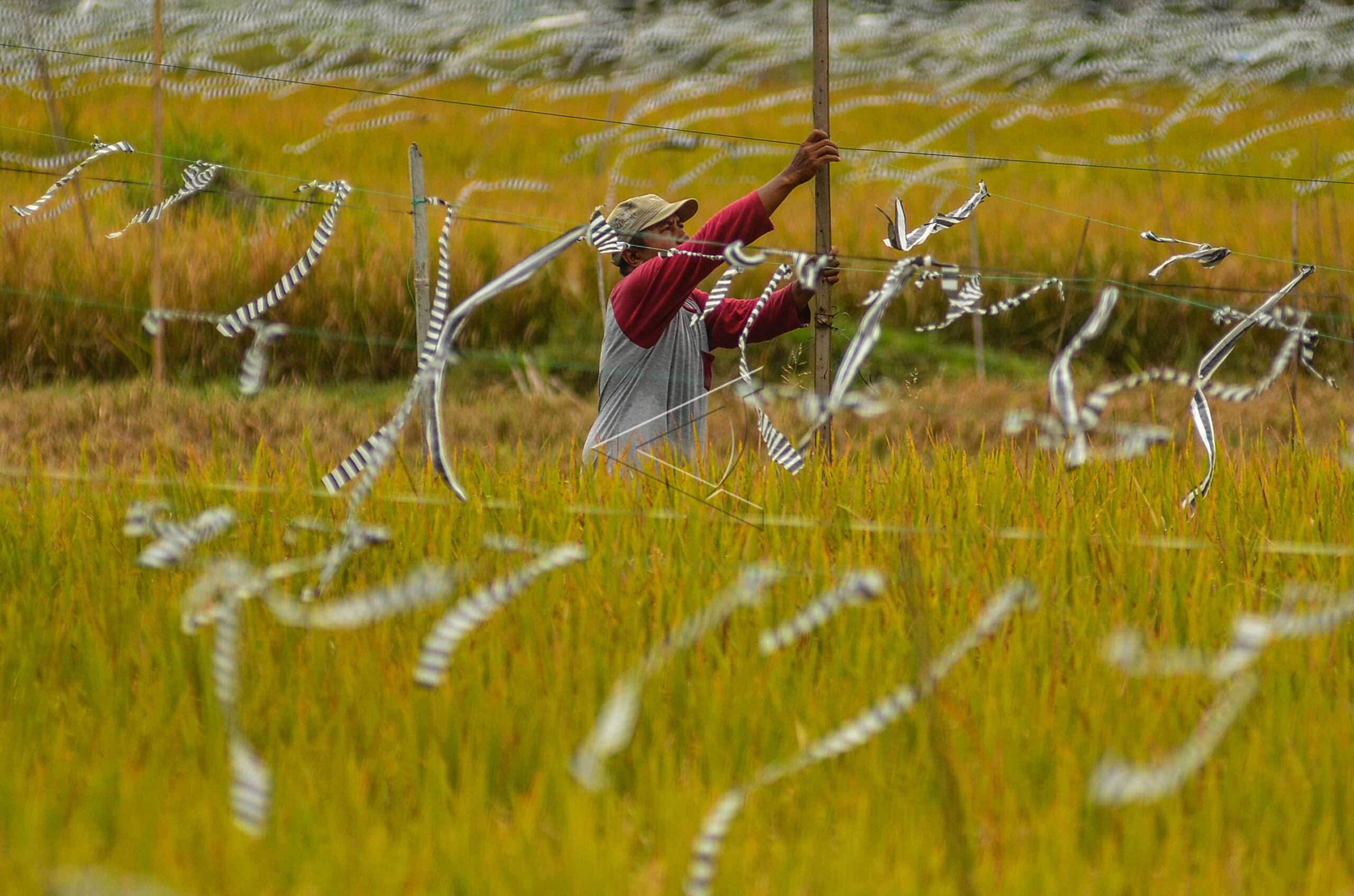 A farmer installs birds repellent made of plastic waste in Pangandaran Regency, West Java, July 21, 2019. ANTARA FOTO/Adeng Bustomi/foc/dw/WSJ.