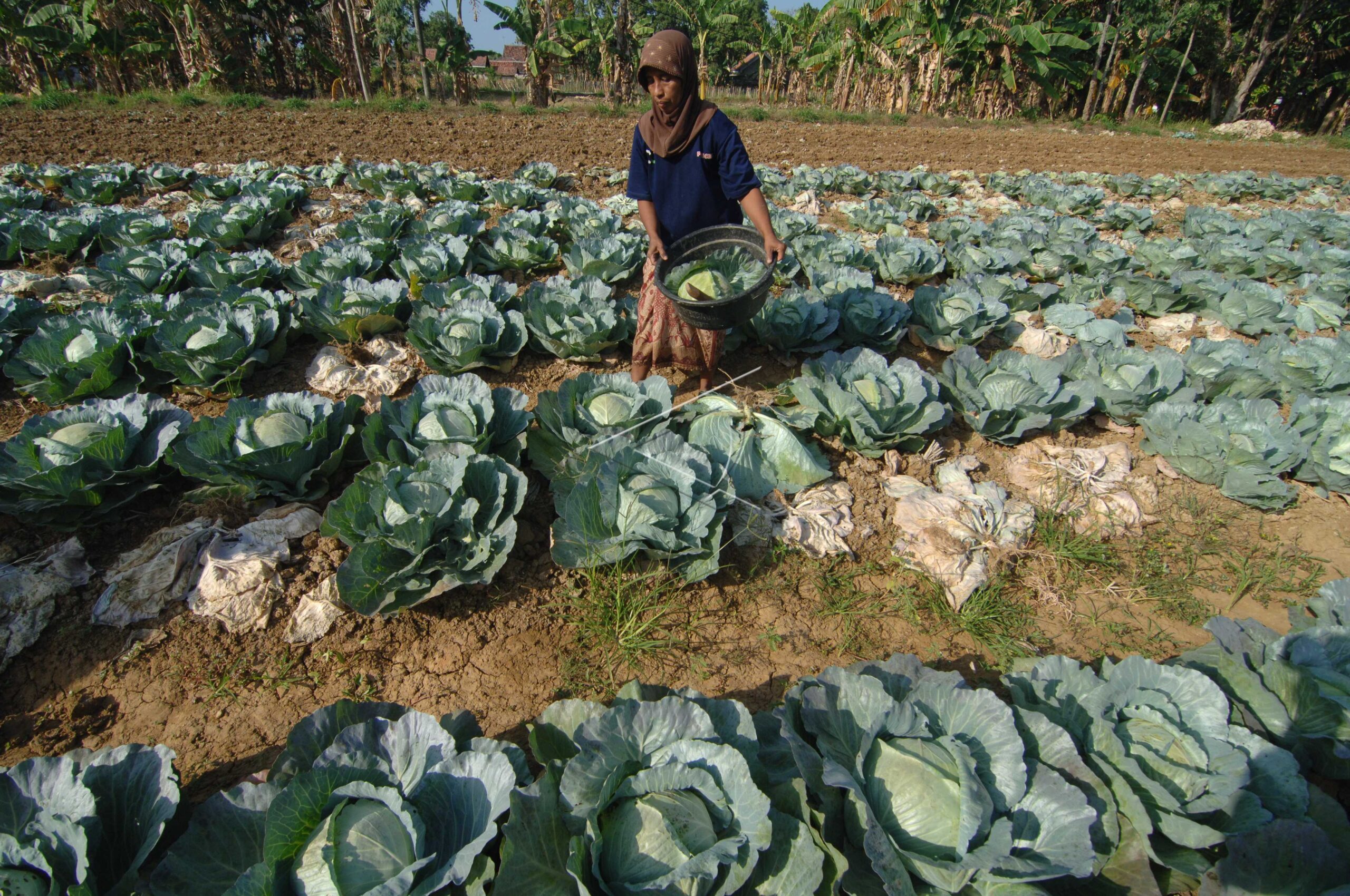 A farmer harvests cabbage in Penaguan Village, Pamekasan, East Java, August 19, 2018. ANTARA FOTO/Saiful Bahri/sa.