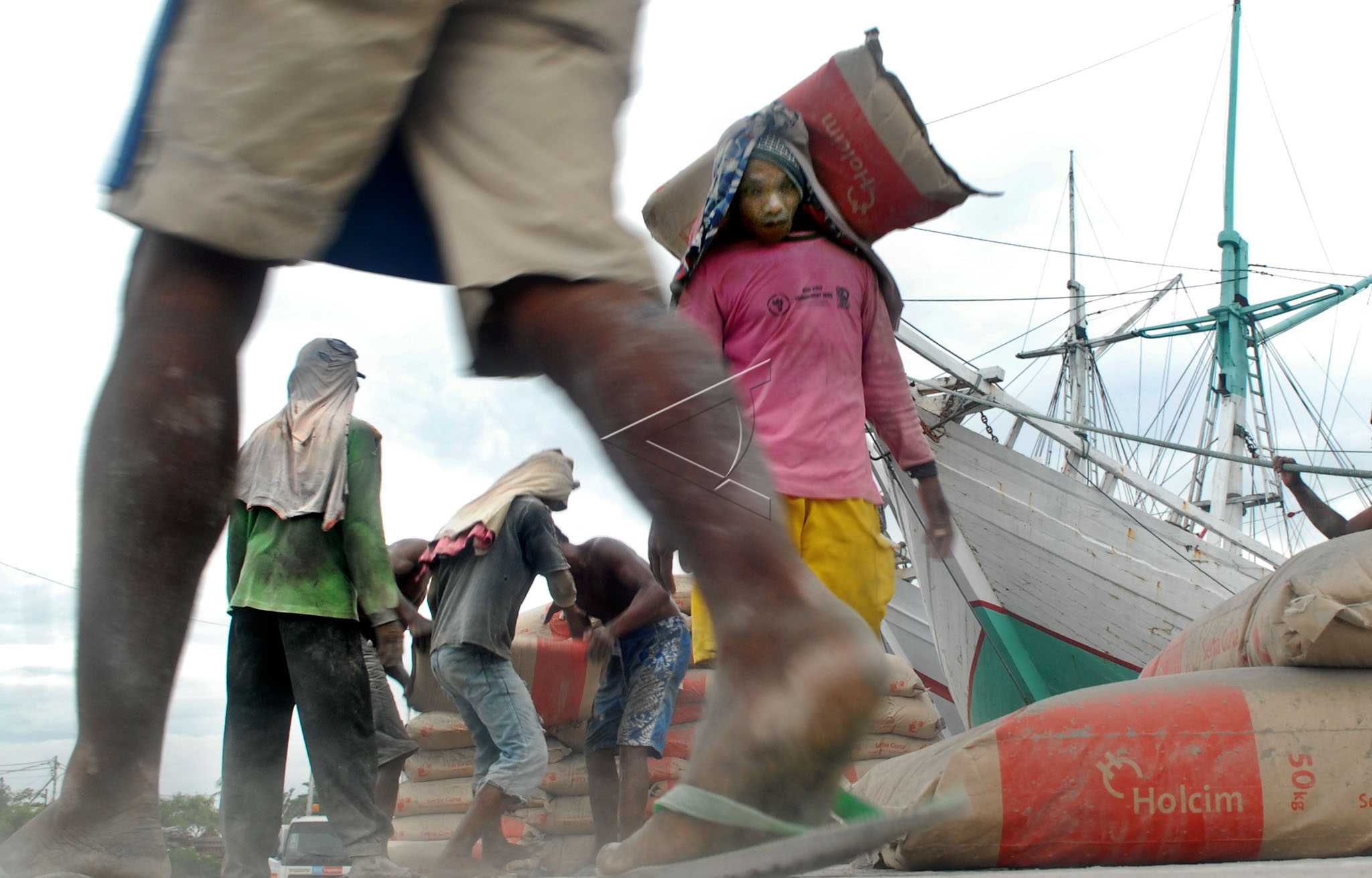Labourers transport sacks of cement into a ship to distribute it to outside Jakarta, at Sunda Kelapa Port in Jakarta, December 25, 2008. ANTARA FOTO/Prasetyo Utomo/ama/asf.