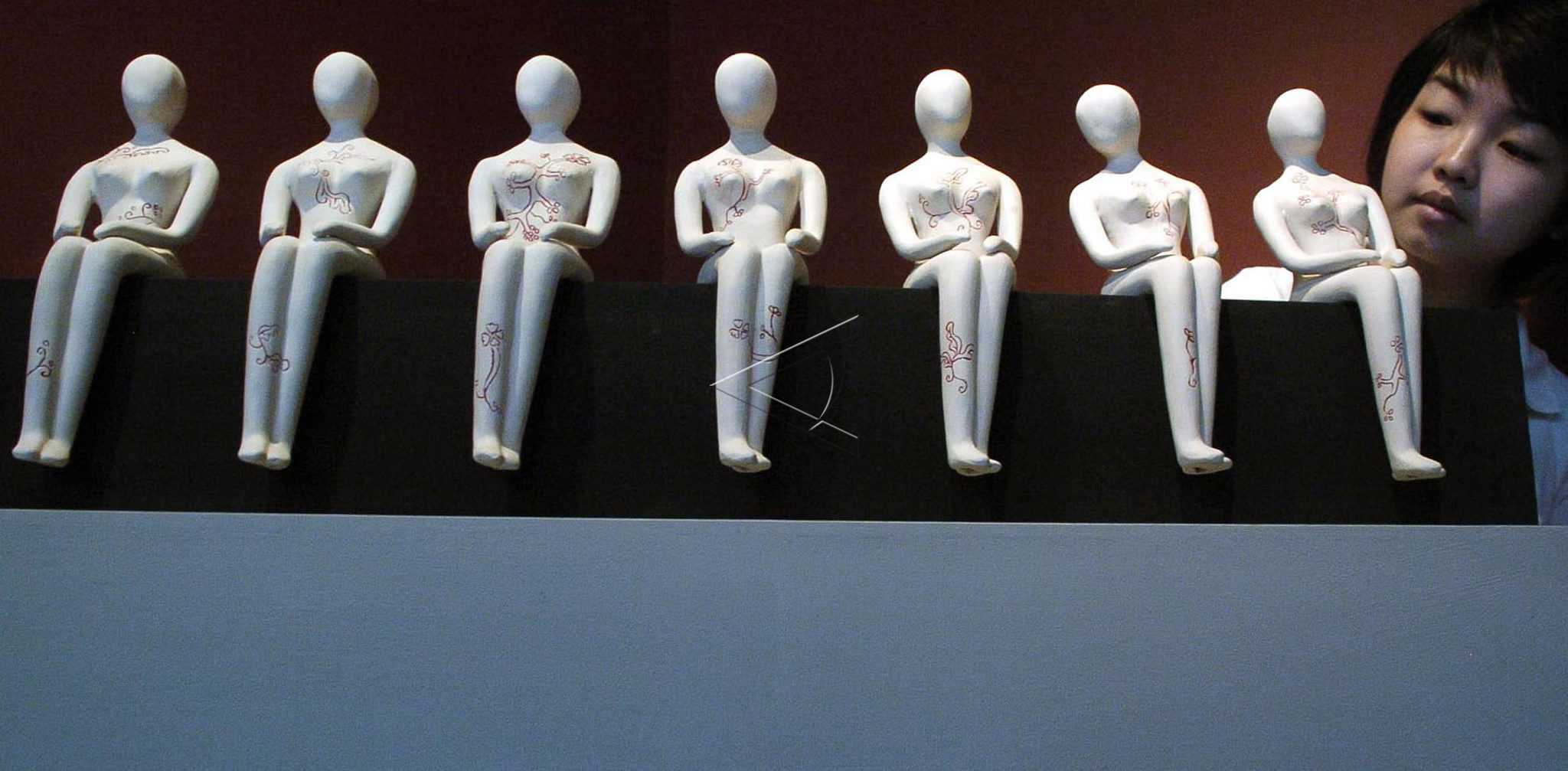 A woman observes a row of ceramic sculptures by Surabaya artist Jenny Lee, on display at House of Sampoerna Art Gallery Surabaya, December 29, 2009. ANTARA FOTO/Eric Ireng/asf/tom/sa.