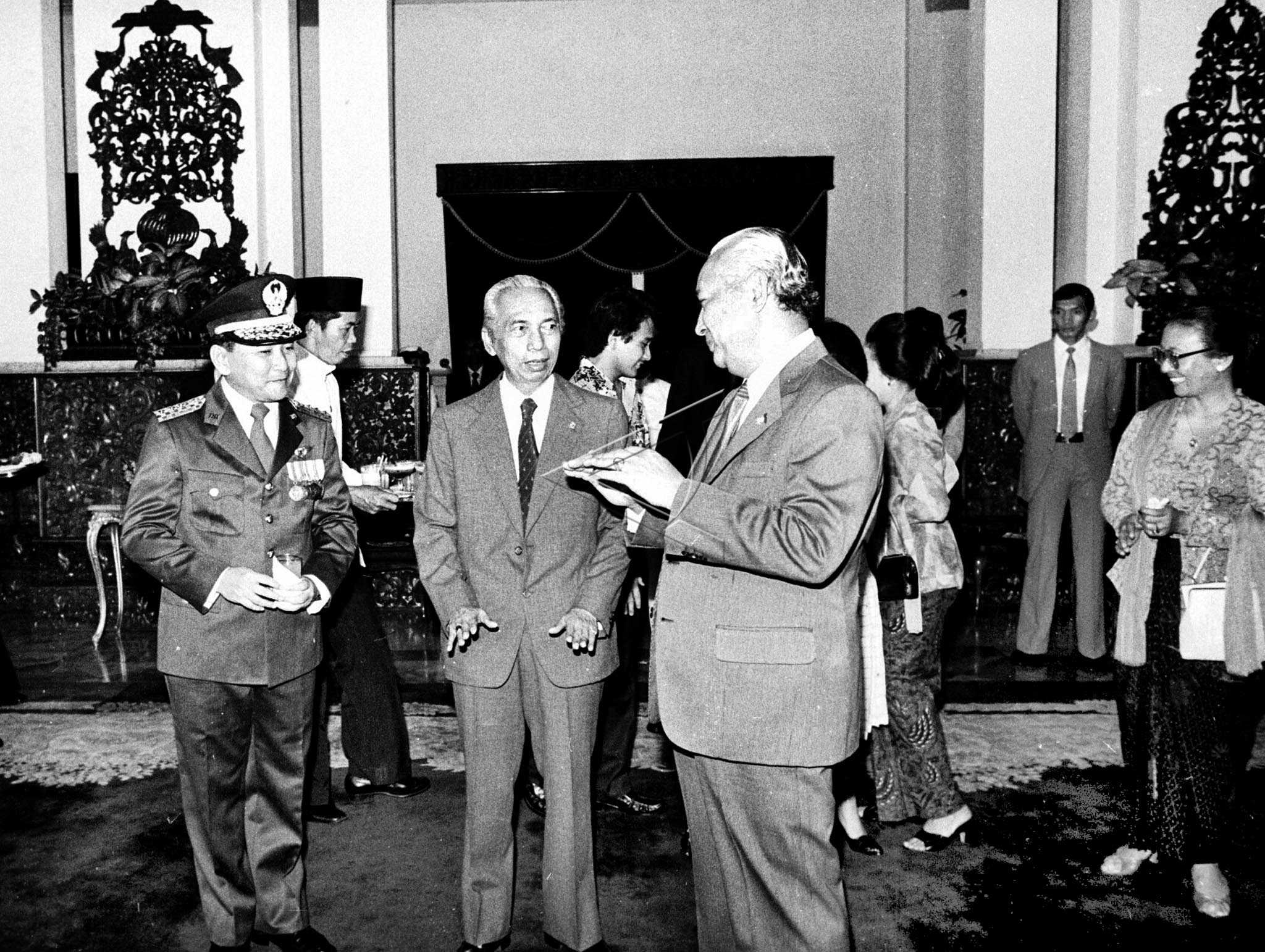 President Soeharto (third left) chats with Vice President Adam Malik (second left) and Chief of Army Staff (KASAD) Lt. Gen. Rudini after handing over the position of KASAD from old official General Poniman at State Palace in Jakarta, Maret 3, 1983. ANTARA FOTO/P02/hp/asf/nym/sa.