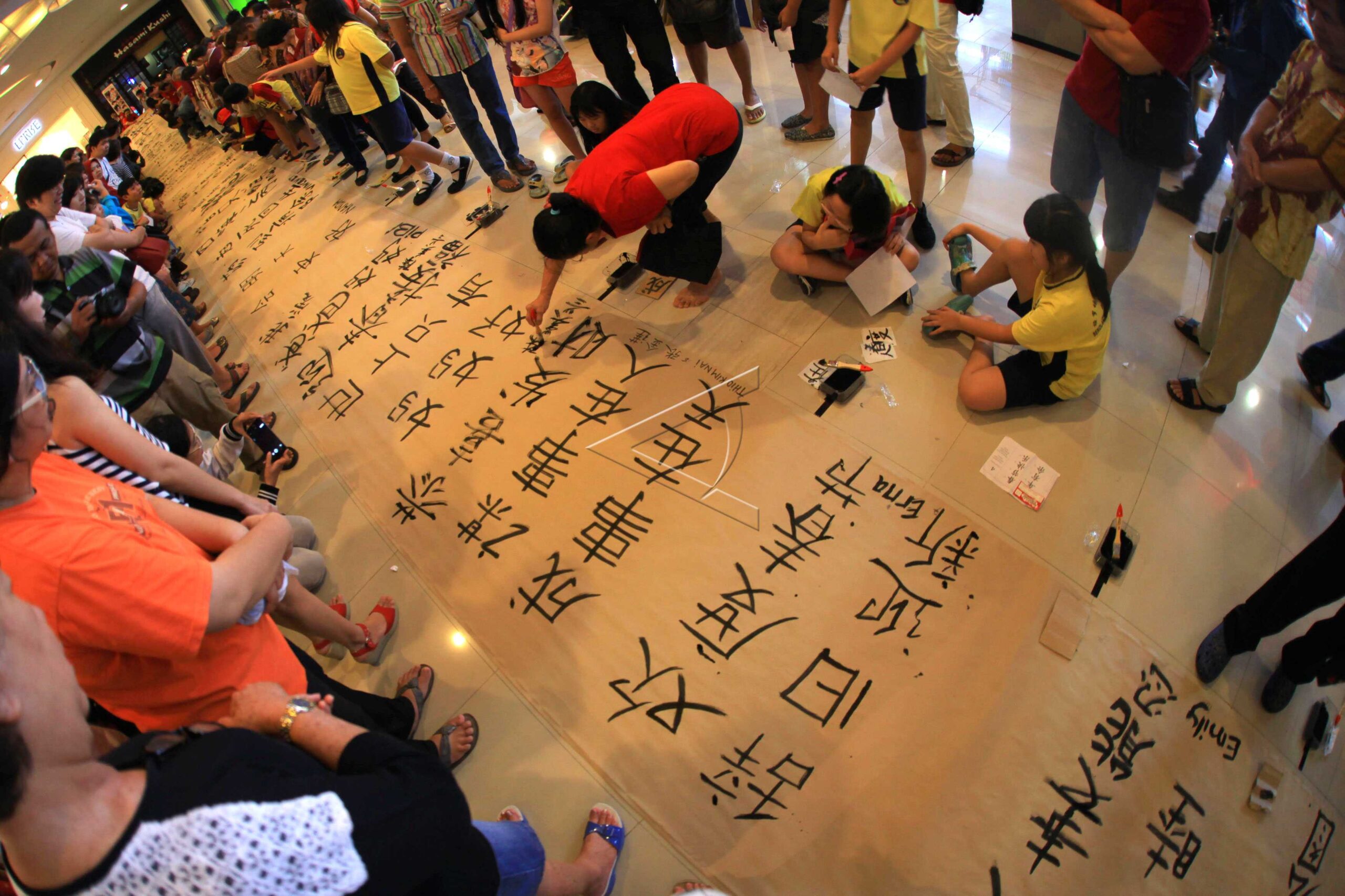 Visitors write Chinese Shufa calligraphy on a 600-meters paper during an event called Shufa On The Street to celebrate Chinese New Year in Paragon Mall, Solo, Central Java, on February 7, 2016. ANTARA FOTO/Maulana Surya/foc/dw/nym.