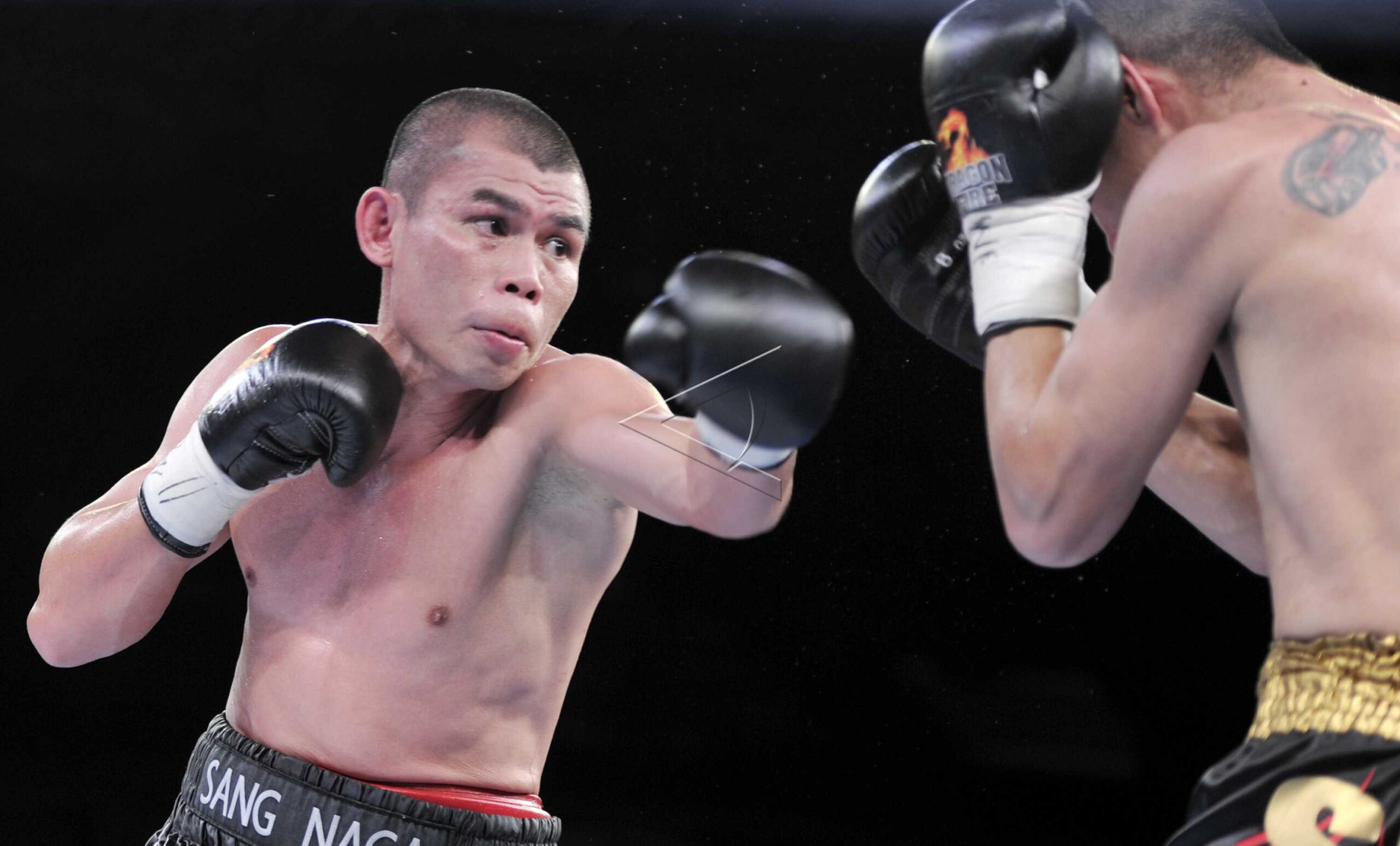 Indonesian boxer Chris John (L) punches Japanese boxer Shoji Kimora during a boxing fight for the WBA Featherweight title at Marina Bay Sands, Singapore May 5, 2012. FOTO ANTARA/Ismar Patrizki/dw/nym/sa.
