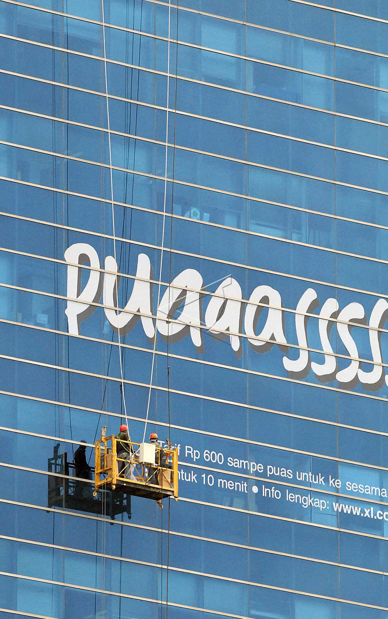 Workers clean the glass of a mobile operator’s office in Jakarta, Maret 23, 2008. ANTARA FOTO/Fanny Octavianus/asf/tom/sa.