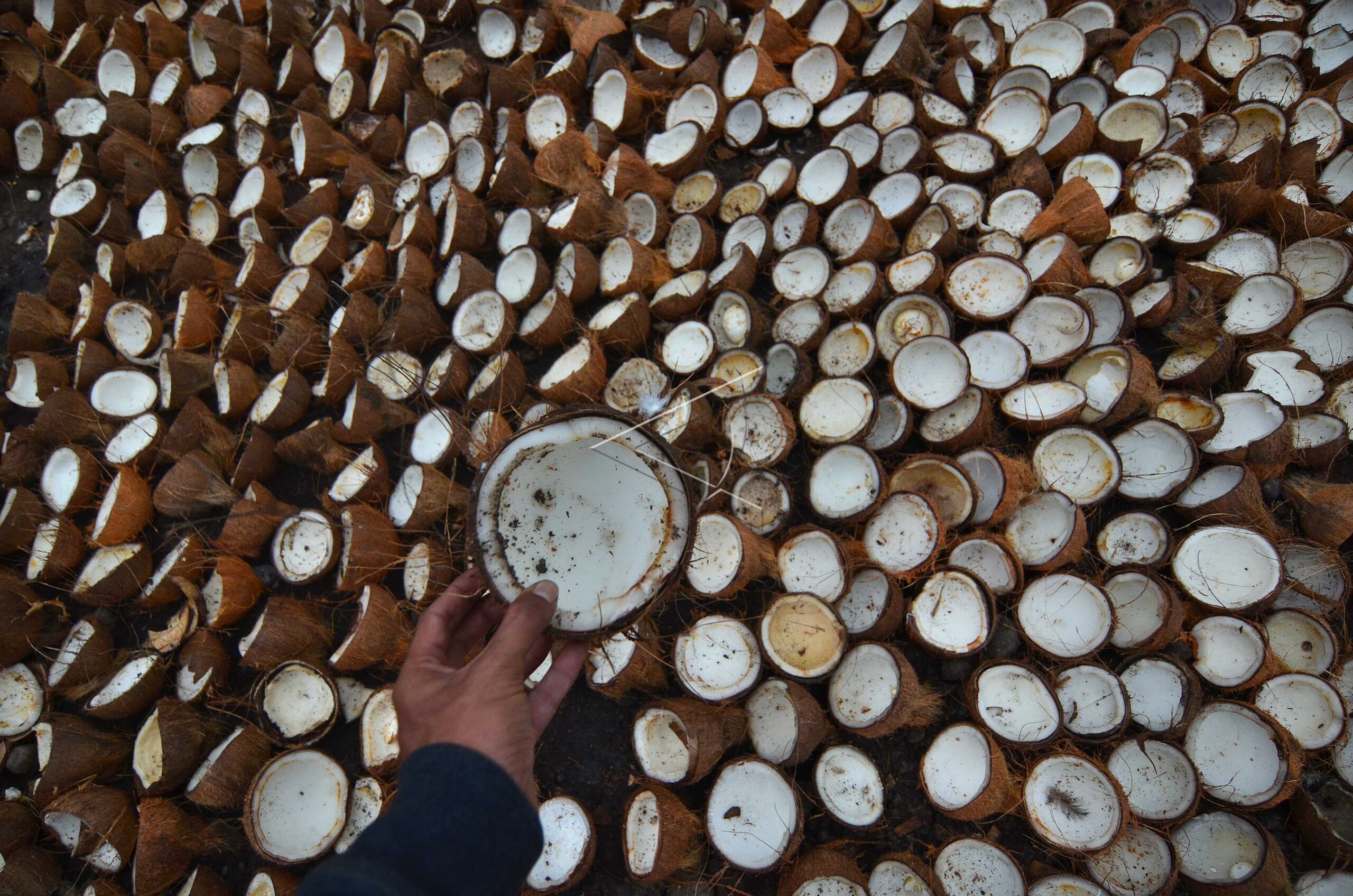 A worker peels coconuts to be copra in Kampung Margaluyu, Ciamis, West Java, July 20, 2018. ANTARA FOTO/Adeng Bustomi/sa.