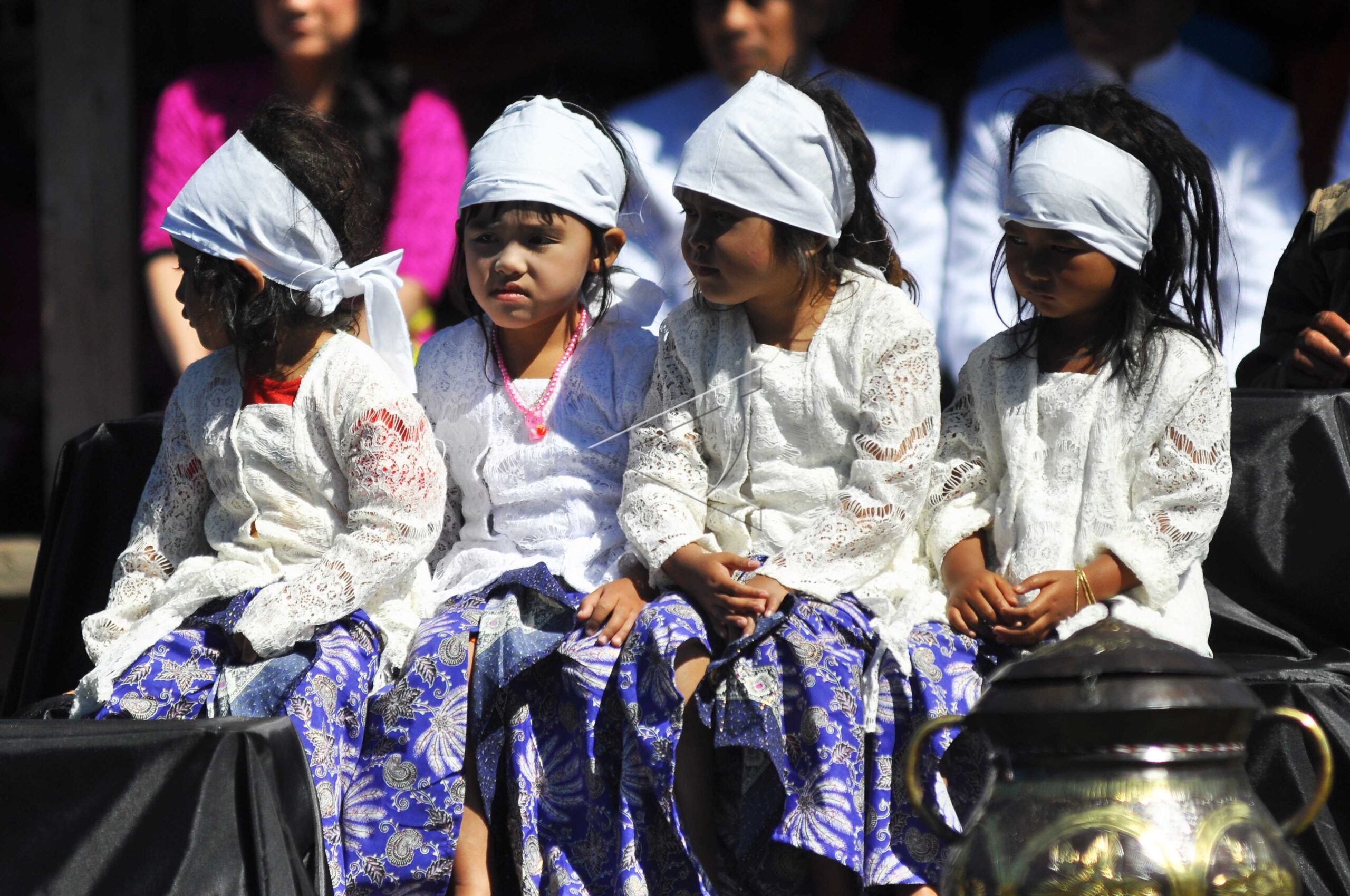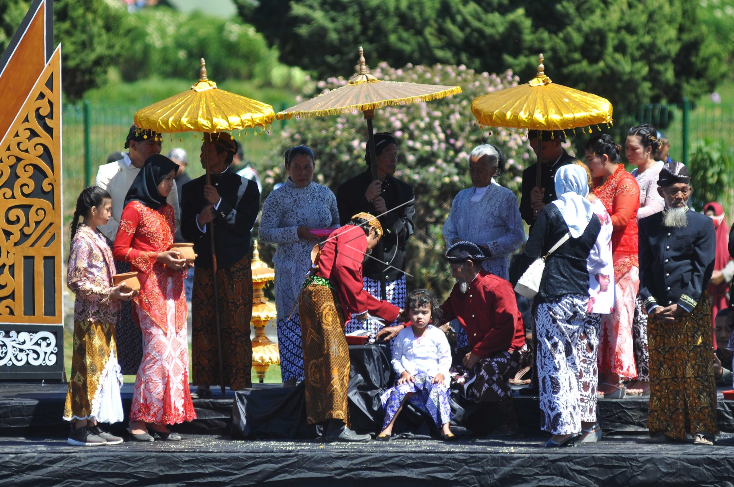 Elder of the tribe splashes water on a ritual of cutting dreadlocks on a child during the 2019 Dieng Culture Festival (DCF) at the Arjuna Temple complex, Dieng Kulon Village, Batur, Banjarnegara, Central Java, August 4, 2019. ANTARA FOTO/Anis Efizudin/wsj/dw/nym