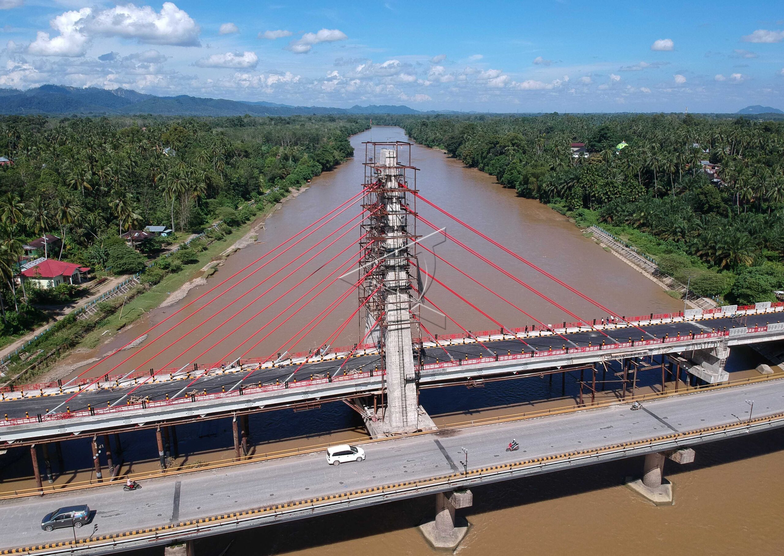 Several vehicles cross the old Dareh River Bridge next to the new Dareh River Bridge which is still under construction on the Sumbar-Jambi Cross Sumatra Road, Punjung Island, Dharmasraya, West Sumatera, on Maret 30, 2019. ANTARA FOTO/Wahdi Septiawan/dw/sa.