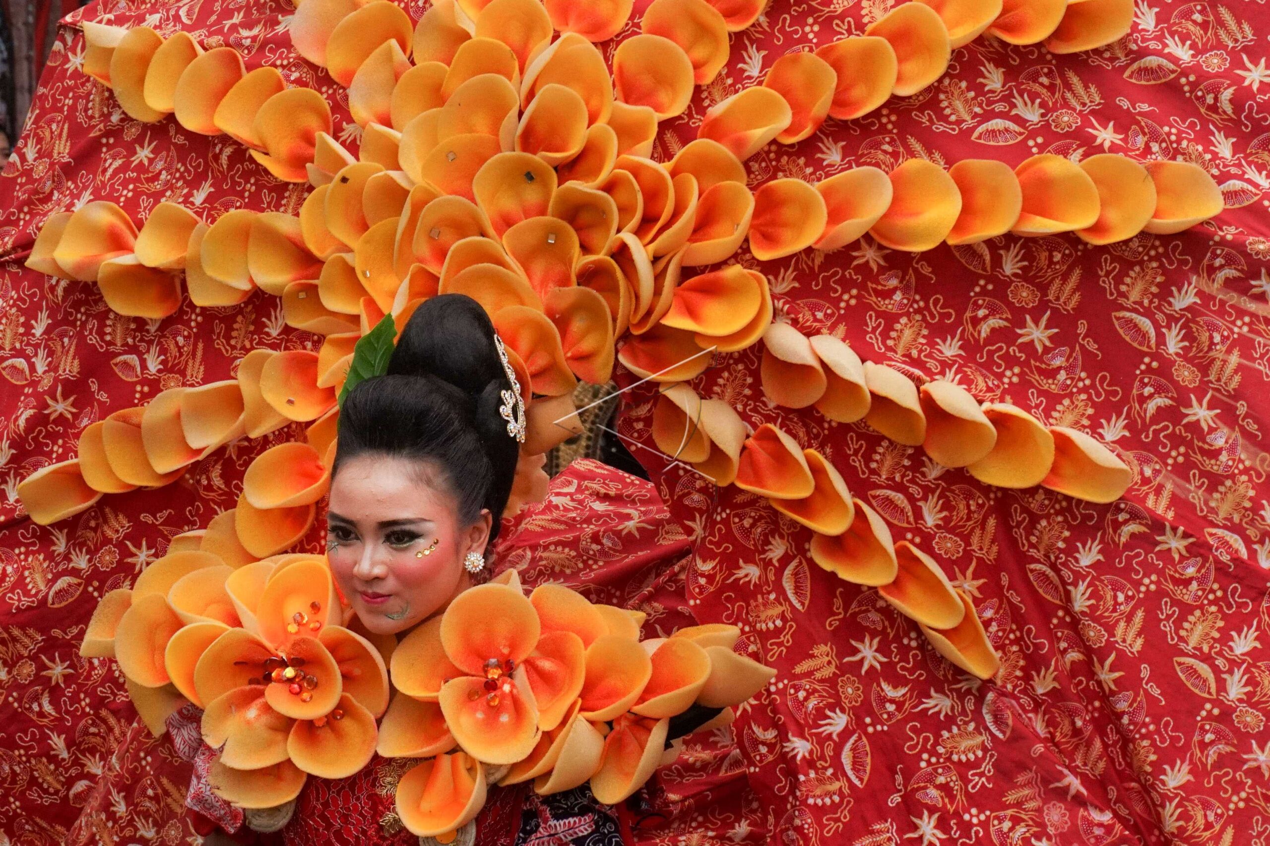 A participant wears regional unique dress during 2015 Dekranasda Carnival Central Java at Satria Purwokerto Sports Complex in Banyumas, Central Java, August 22, 2015. ANTARA FOTO/Idhad Zakaria/kye/dw/wpa.