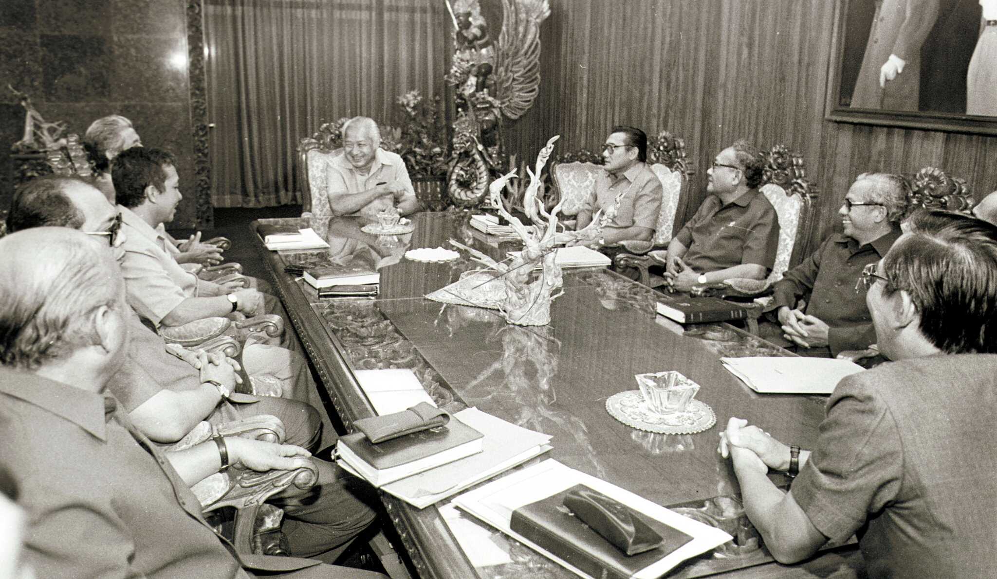 President Soeharto (center) talks with several ministers for the economy, finance and industry to set new policies in trade and monetary as a follow-up to the devaluation, in a limited meeting at Bina Graha, Jakarta, October 25, 1986. ANTARA FOTO/N04/asf/nym/sa.