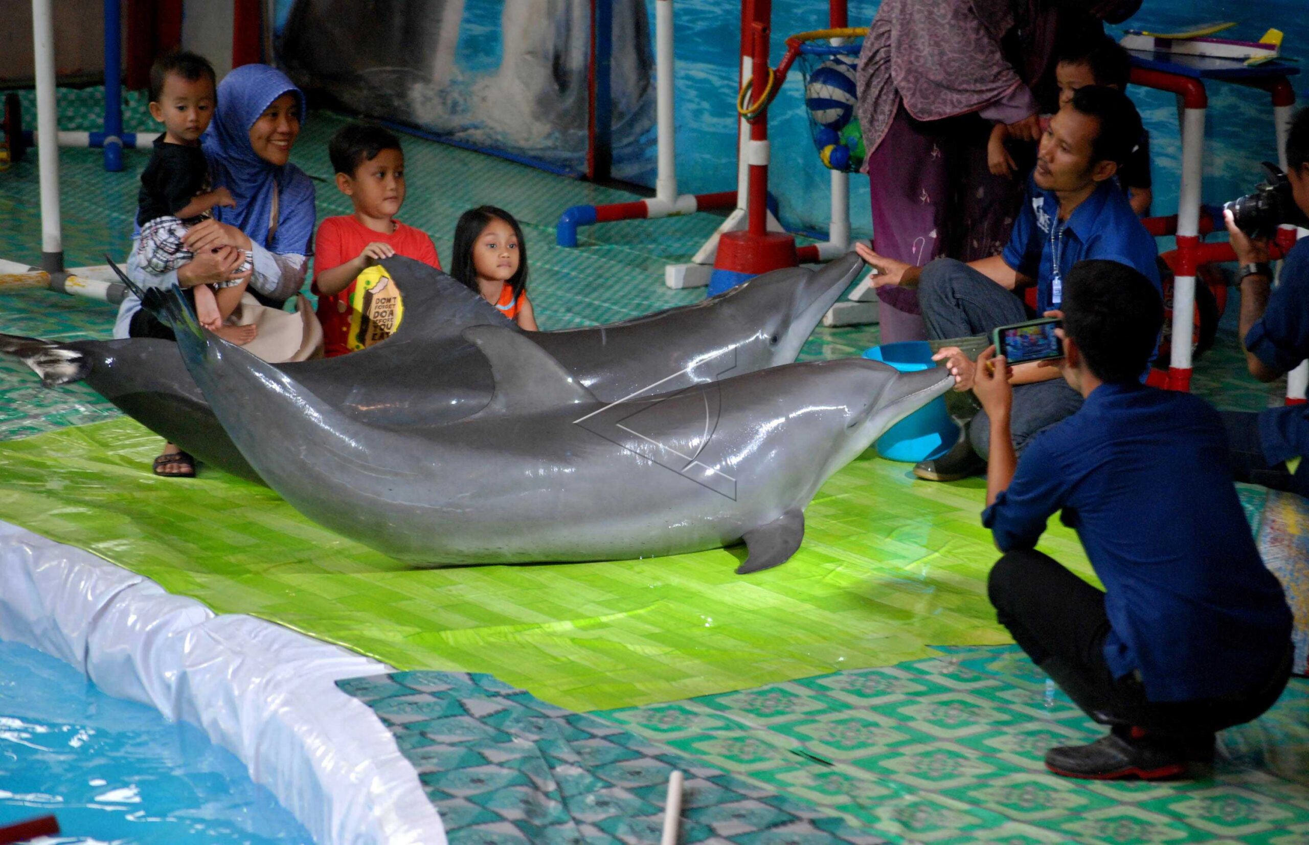Several visitors take photos with dolphins during the performance of animal circus in Banyumanik, Semarang, Central Java, August 31, 2016. ANTARA FOTO/Aditya Pradana Putra/dw/tom.