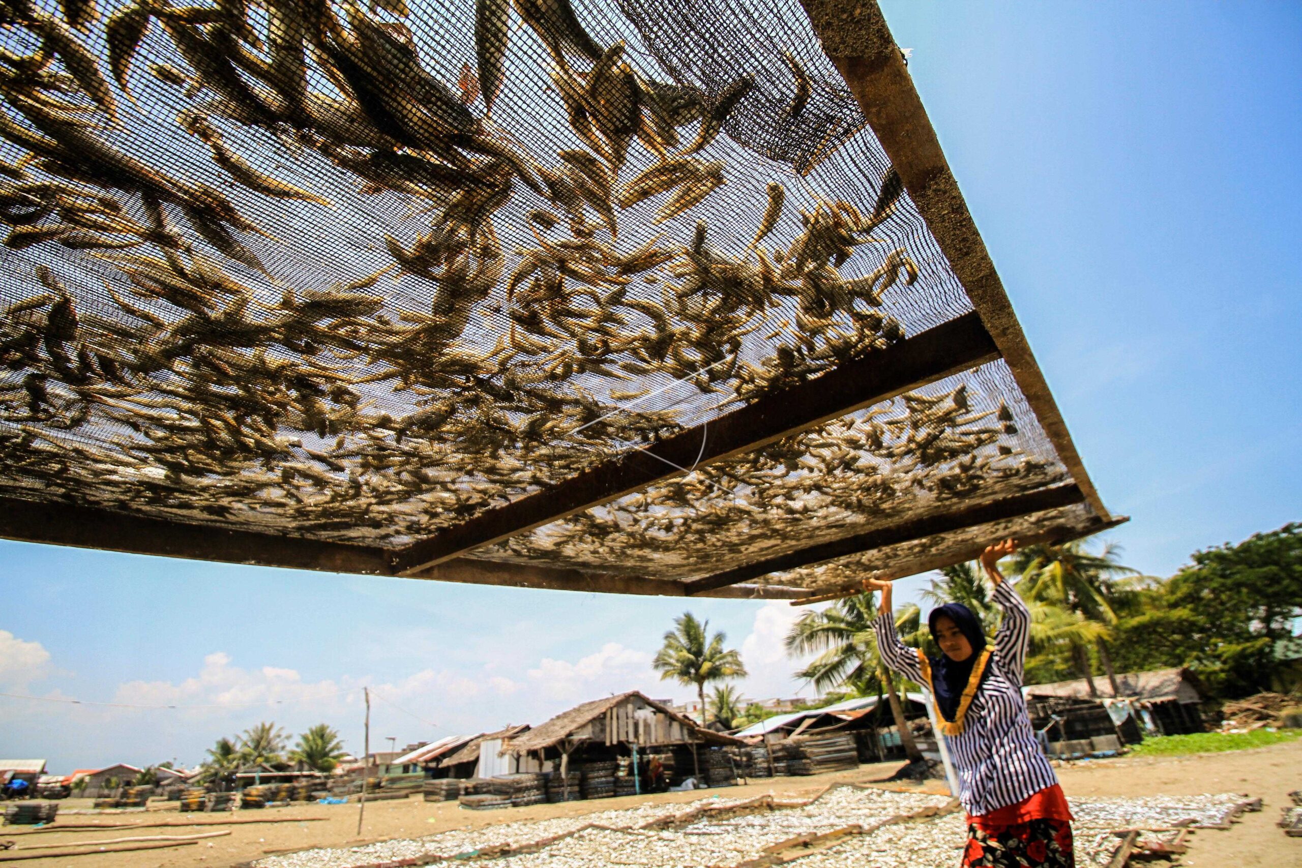 Worker dries the anchovies and Meneng fish (Sardinella fimbriata) in Lhokseumawe, Aceh, April 4, 2018. ANTARA FOTO/Rahmad/dw/pras.