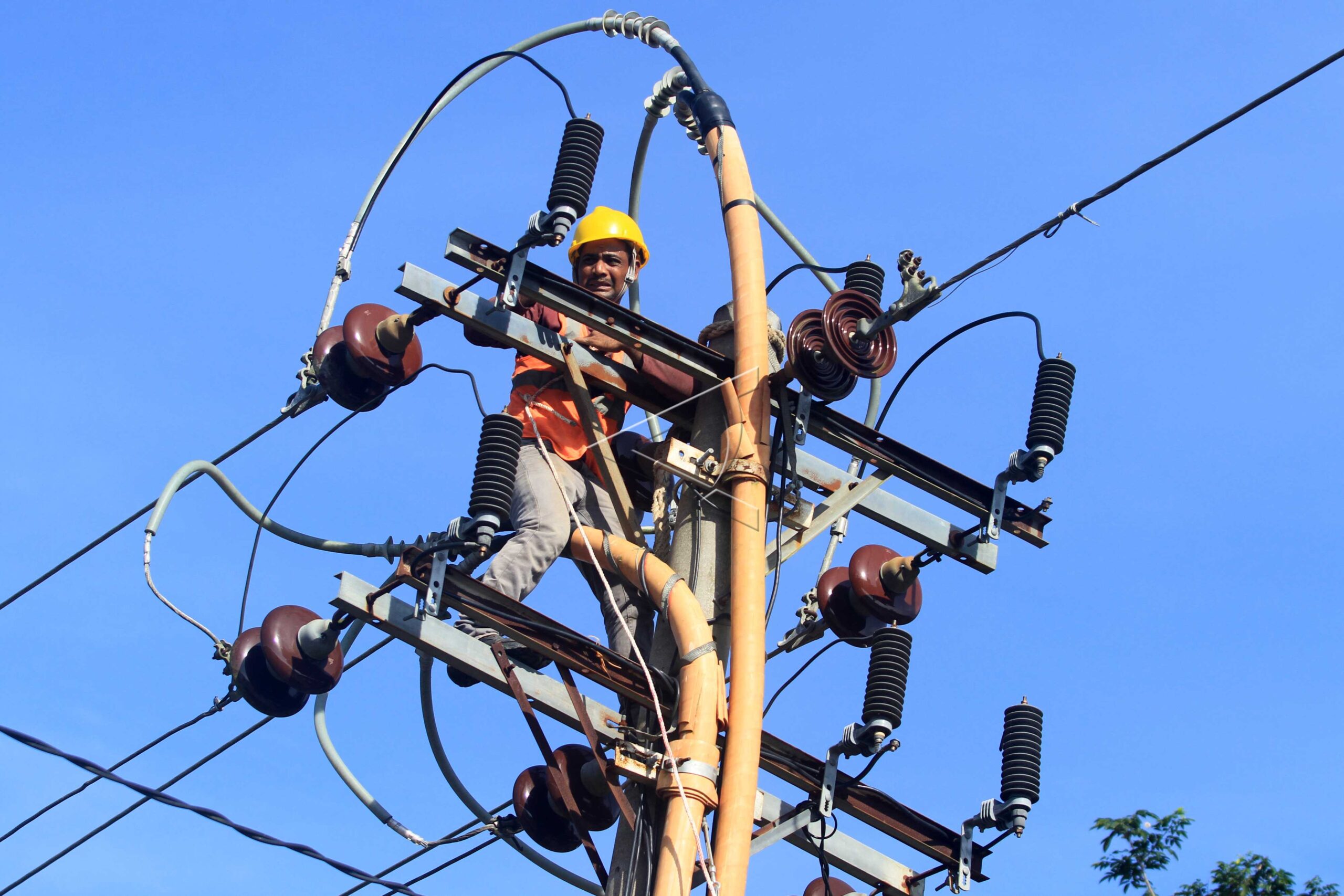 A worker repairs and replace the electrical wire of PLN at Blang Jambe Village in Julok, East Aceh, Aceh, December 8, 2018. ANTARA FOTO/Syifa Yulinnas/dw/pras.