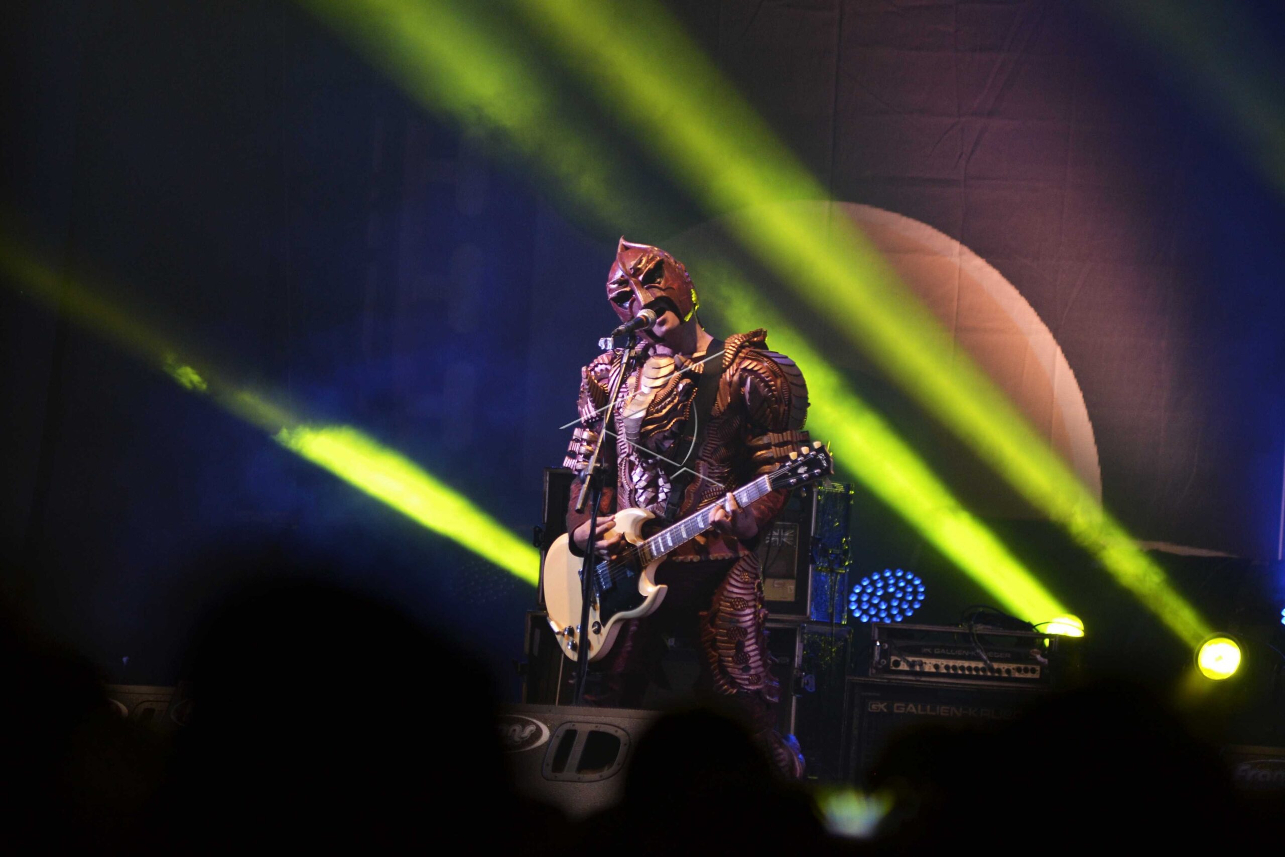 Guitarist and vocalist of the rock music group Endank Soekamti, Dori Soekamti in a super hero outfit entertains her fans while performing in Bekasi, West Java, November 13, 2019 at night. Endank Soekamti’s music group perform songs including Maling Kondang, Gotong Royong, and several other hit songs. ANTARA FOTO/Suwandy/pd/dw/sa.