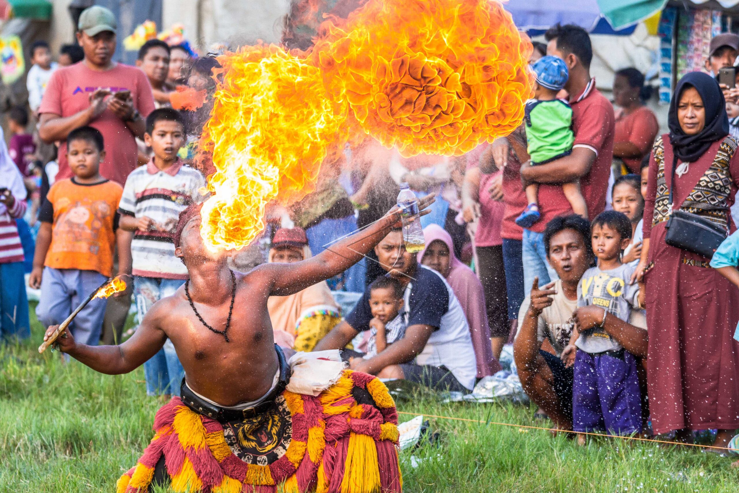 Artist Singo Bolang Kertodiharjo performs fire burst performance during East Java Traditional Art Performance in Bandungrejo Village, Mranggen, Demak, Central Java, March 14, 2018. ANTARA FOTO/Aji Styawan/aww/dw/wpa.
