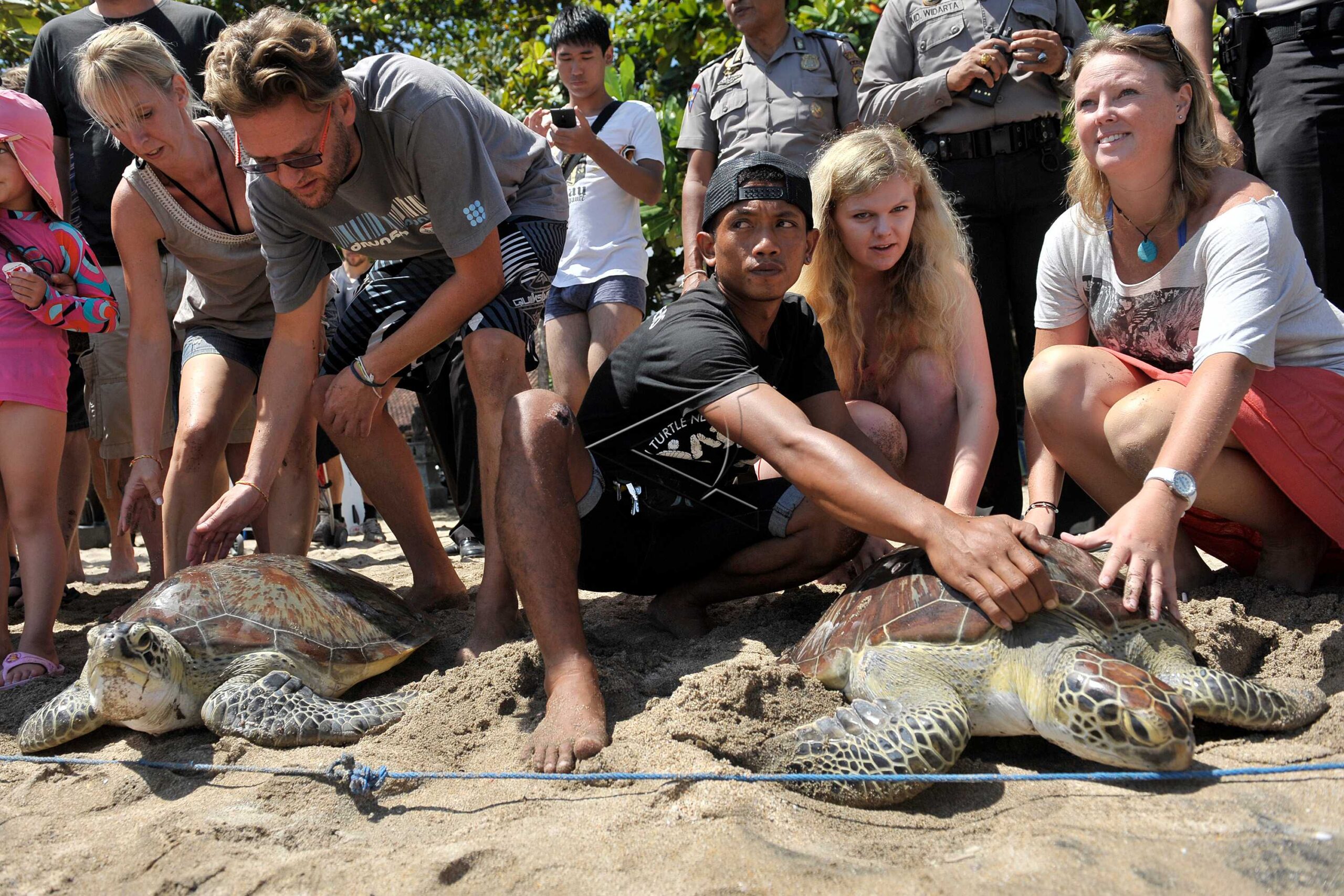 Several tourist put green sea turtles (Chelonia Mydas) on the shore during the re-release of the rare animal in Kuta Beach, Bali, August 13, 2014. Police confiscates 9 green sea turtles from smugglers. Police and tourists release to their habitat as well as tourist attractions. ANTARA FOTO/Nyoman Budhiana/ed/ama/hp/sad.