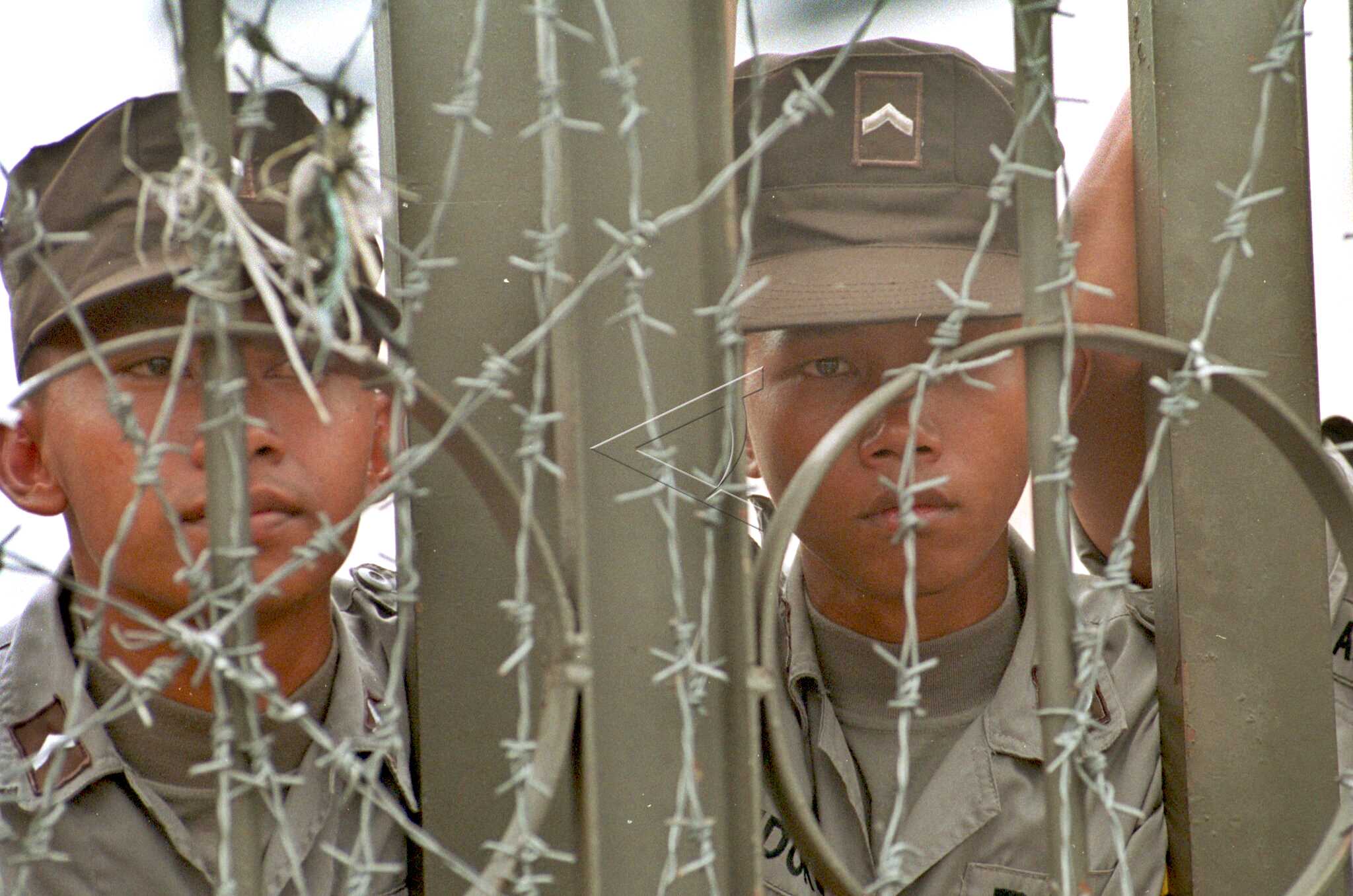 Two security officers stand guard behind the gate during a demonstration by a number of mass groups demanding the completion of the Buloggate and Bruneigate cases, at Indonesian Parliament Building, Senayan, Jakarta, January 23, 2001. ANTARA FOTO/Maha Eka Swasta/asf/tom/sa.