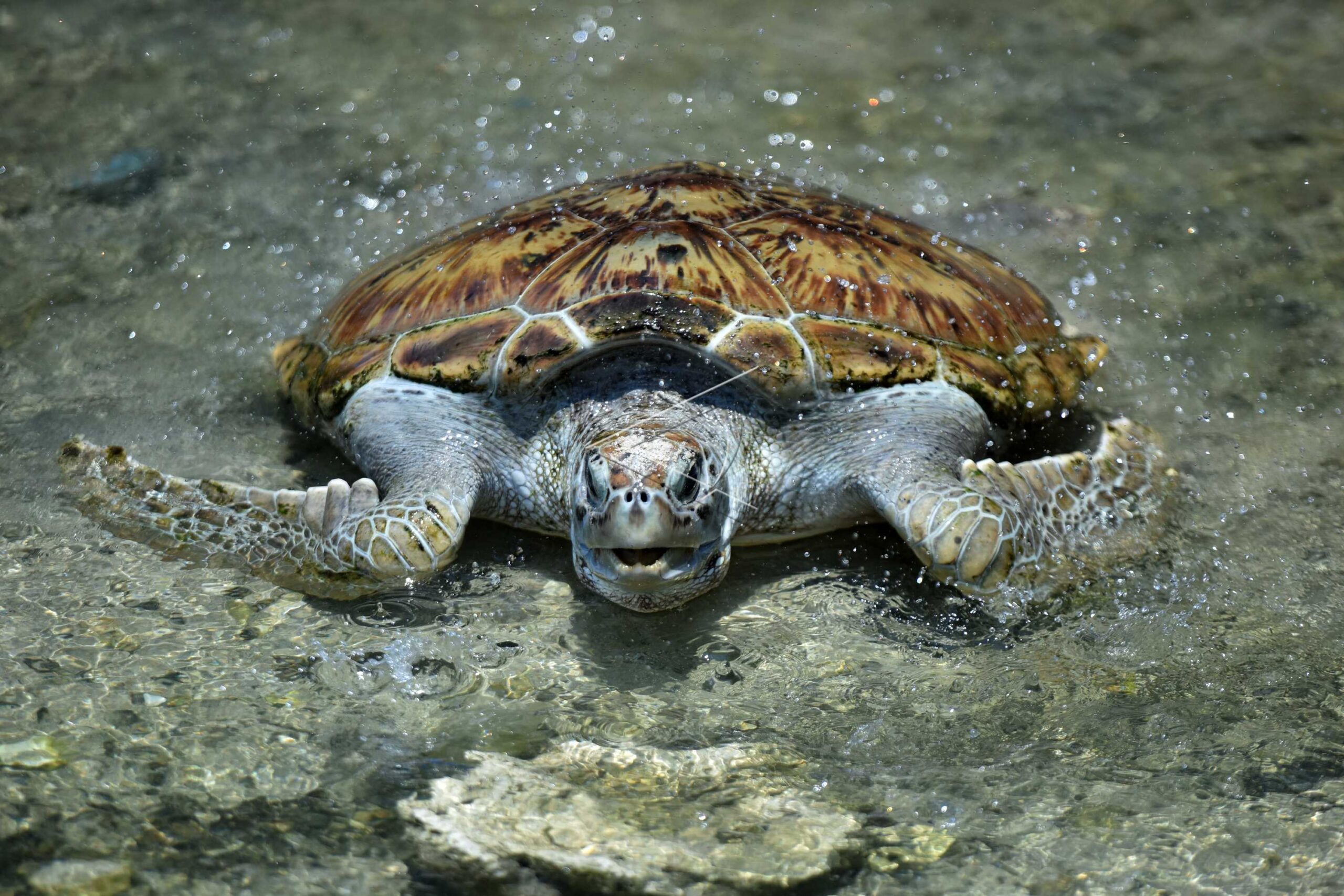 A Hawksbill turtle (Eretmochelys imbricata) swims during the release on Pramuka Island, Thousand Islands, Jakarta, March 24, 2017. ANTARA FOTO/Wahyu Putro A/aww/dw/foc/sad.