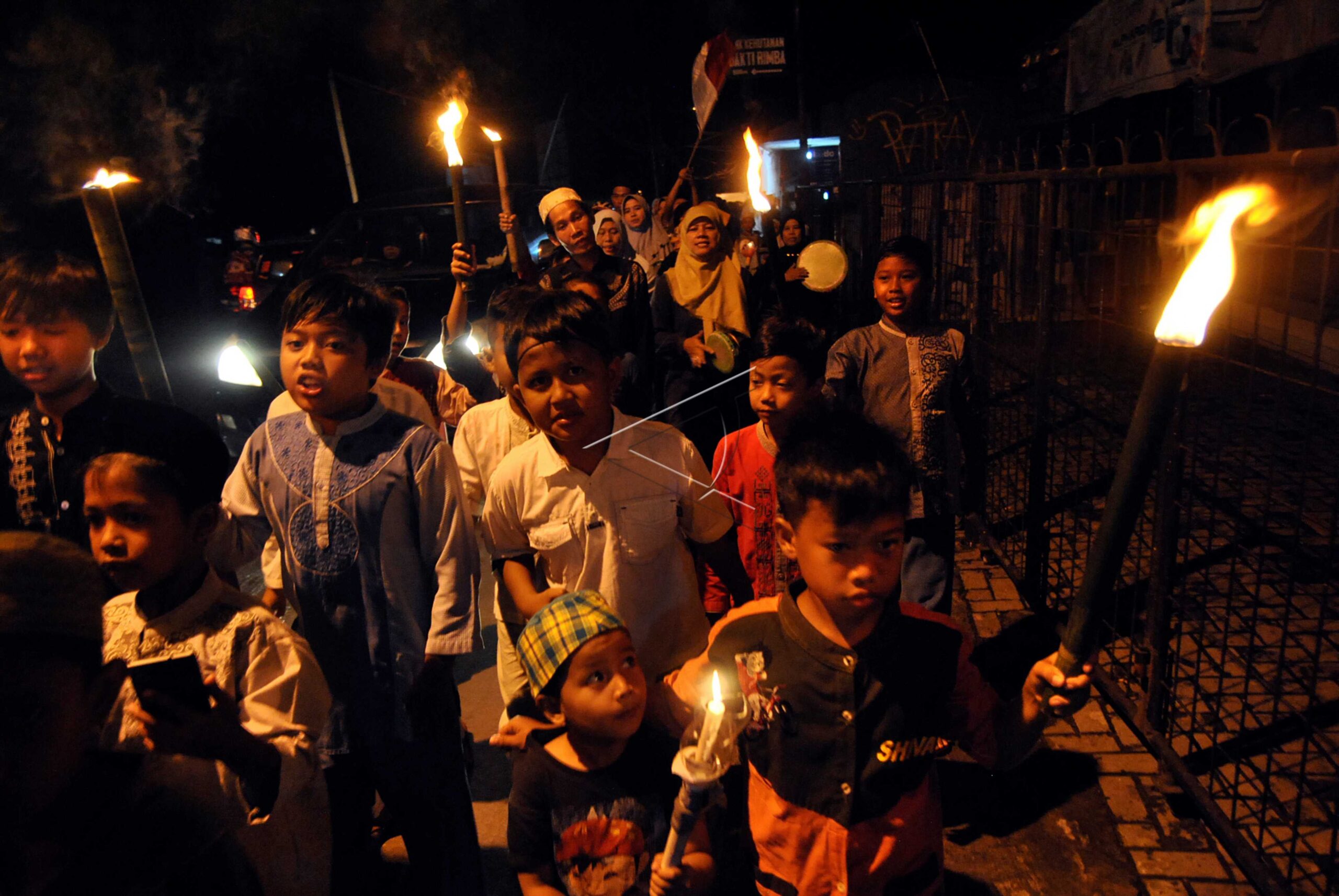 People and their children walk across the street with torch in hands to welcome holy month of Ramadan at Laladon village, Ciomas, Bogor, West Java, May 4, 2019. ANTARA FOTO/Arif Firmansyah/foc/dw/nym