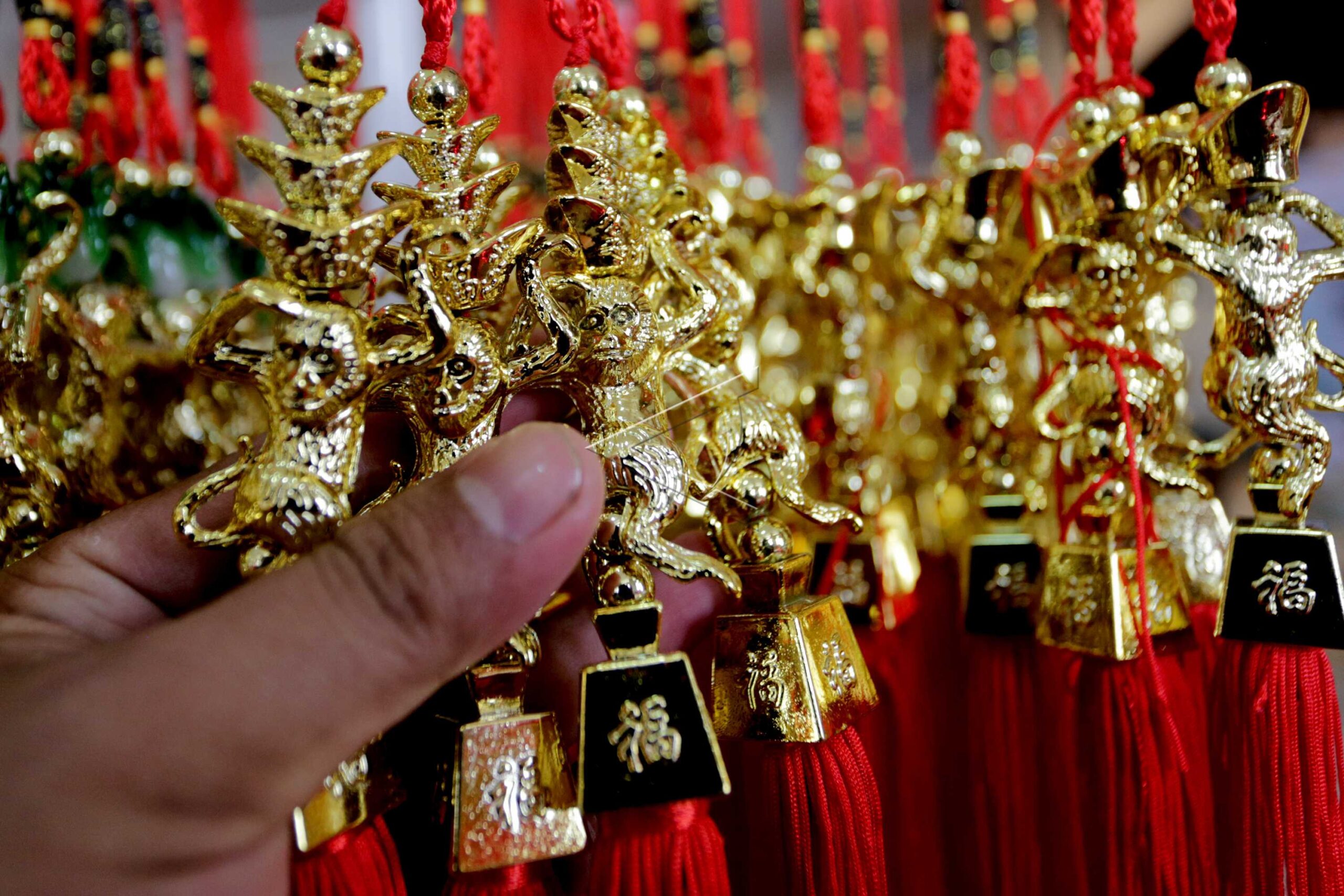 A consumer chooses Chinese knick-knacks related to the zodiac fire monkey at the Chinese New Year Bazaar at Wihara Maitreya Duta Palembang, South Sumatra, January 22, 2016. ANTARA FOTO/Nova Wahyudi/dw/tom/sa.