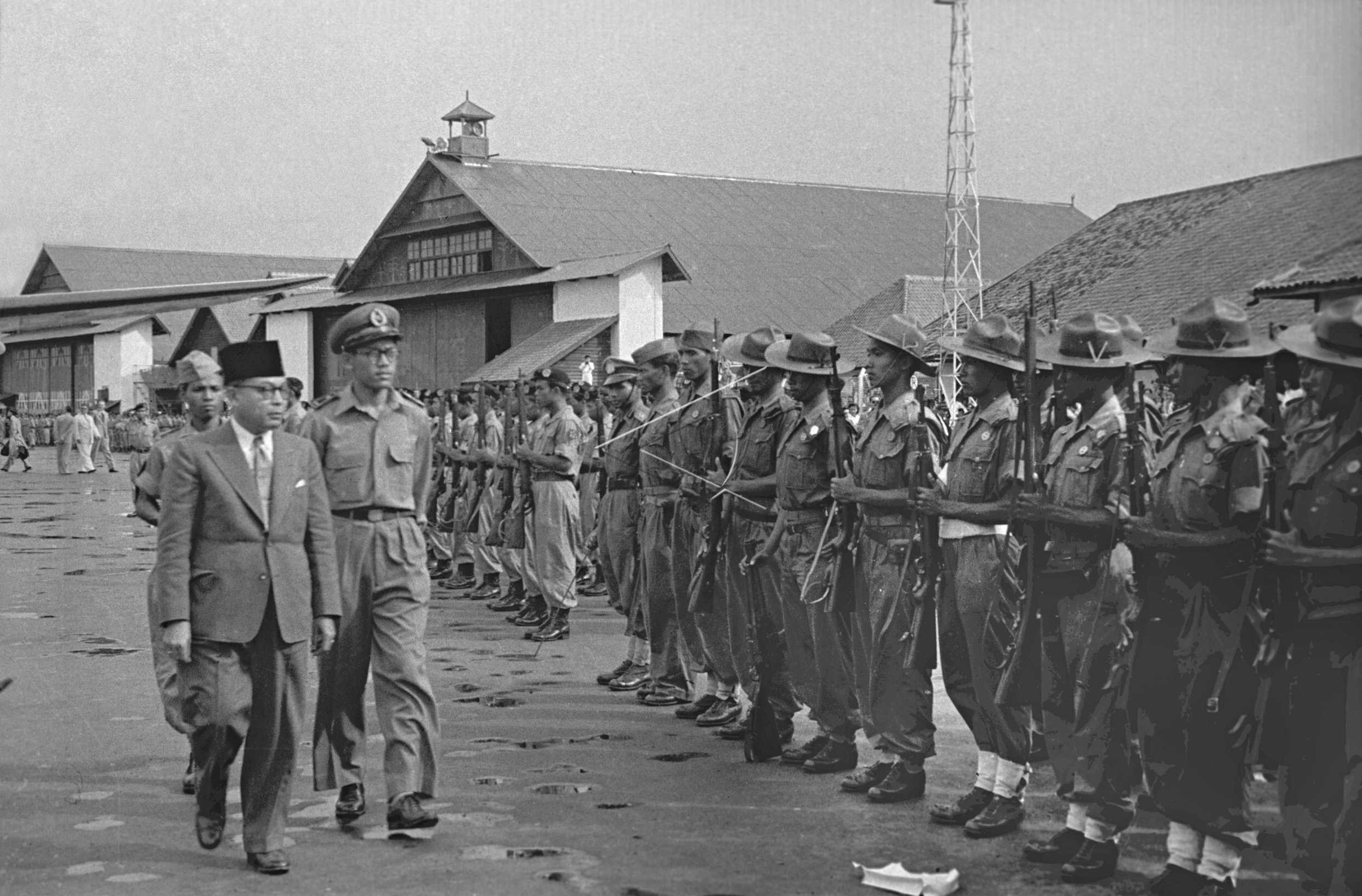 President of Republic of the United States of Indonesia (RIS) Soekarno (left) and Vice President Mohammad Hatta (right) have a cheer after arriving at Kemayoran Airport in Jakarta from Den Haag, January 3, 1950. ANTARA FOTO/IPPHOS/Rei/Koz/pras.