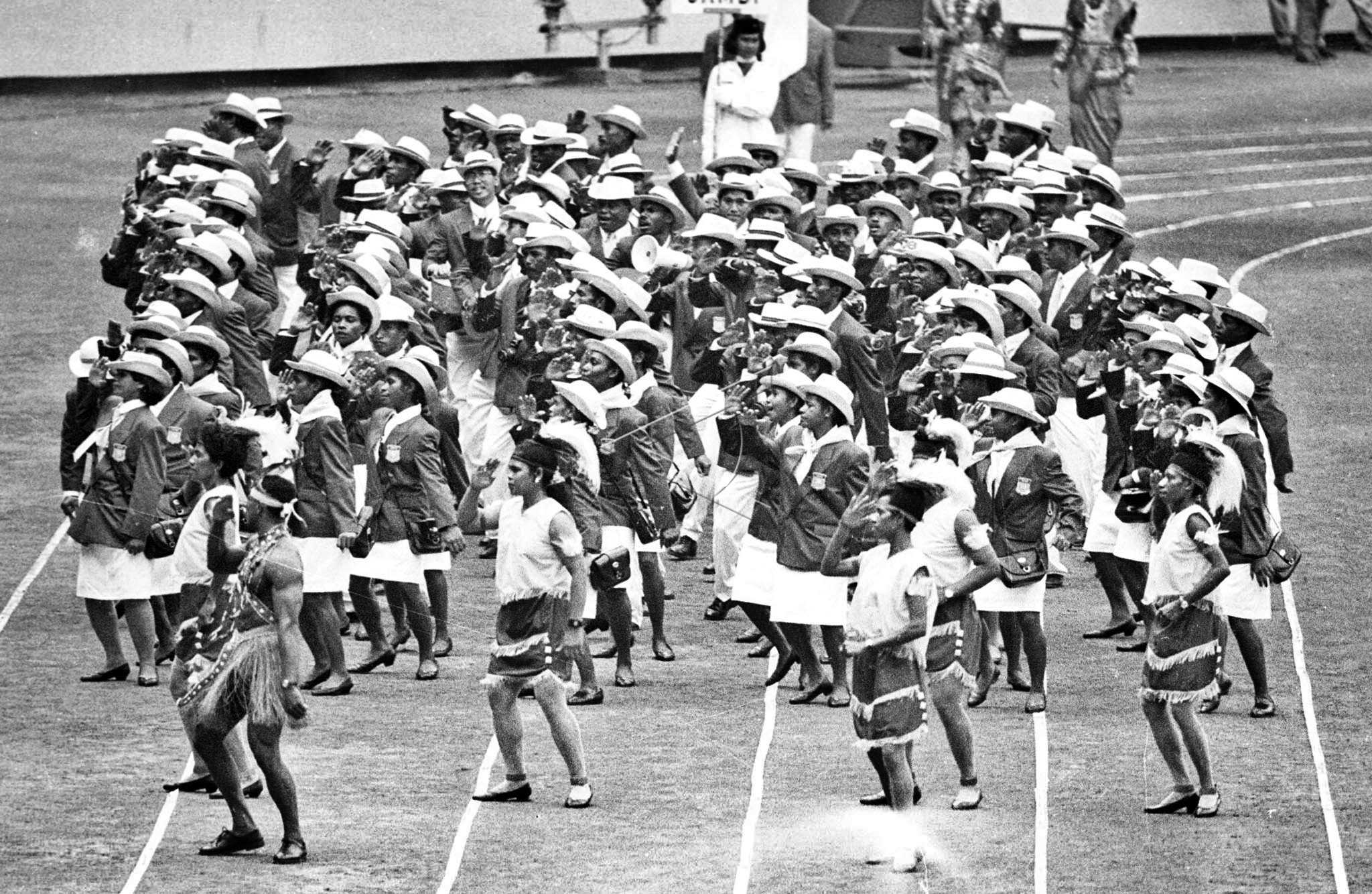 Irian Jaya contingent dressed with traditional clothes and performed local dance passed by in front of honorary tribune during the opening of 13th National Sports Week (PON) at Senayan Main Stadium in Jakarta, September 9, 1993. ANTARA FOTO/PF01/asf/tom.