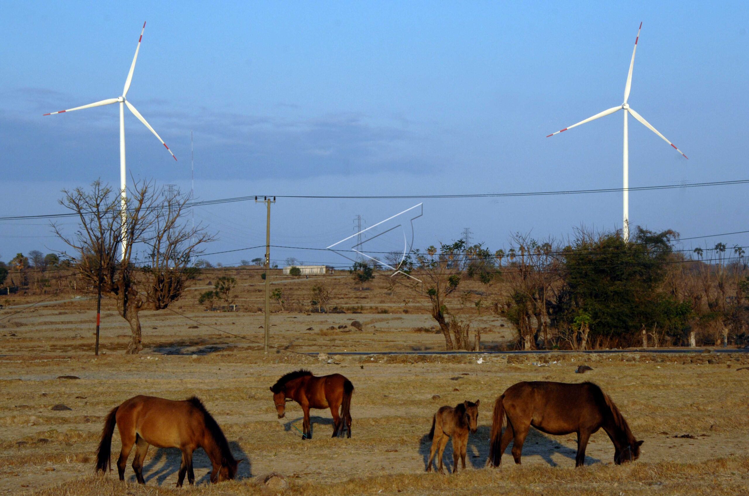 Several horses are seen near the wind power plant (PLTB) in Jeneponto Regency, South Sulawesi, October 15, 2019. The Jeneponto Wind Power Plant which has a capacity of 72 MW will help supply electricity in region of South Sulawesi and West Sulawesi with the rotational power of 20 windmills. ANTARA FOTO/Abriawan Abhe/hp/dw.