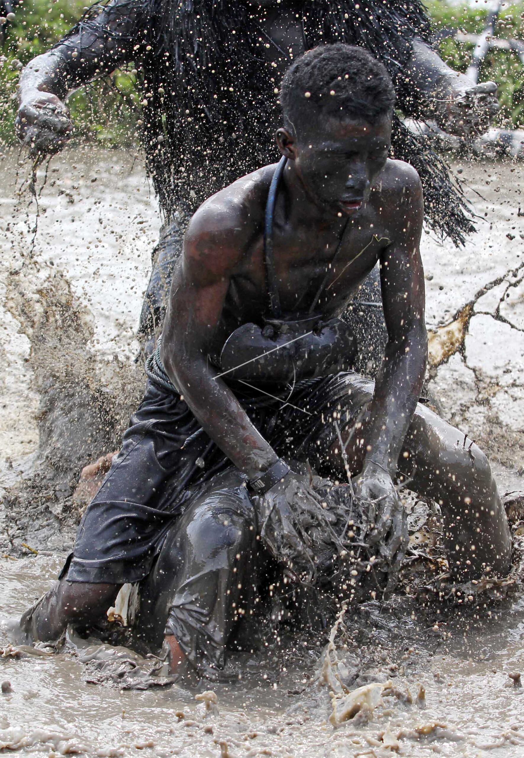 Farmers who dressed themselves similar to buffalo throw the spectator to a muddy field during the ritual “kebo keboan Alas Malang” in Banyuwangi, East Java, October 2, 2016. ANTARA FOTO/Budi Candra Setya/foc/dw/hp.