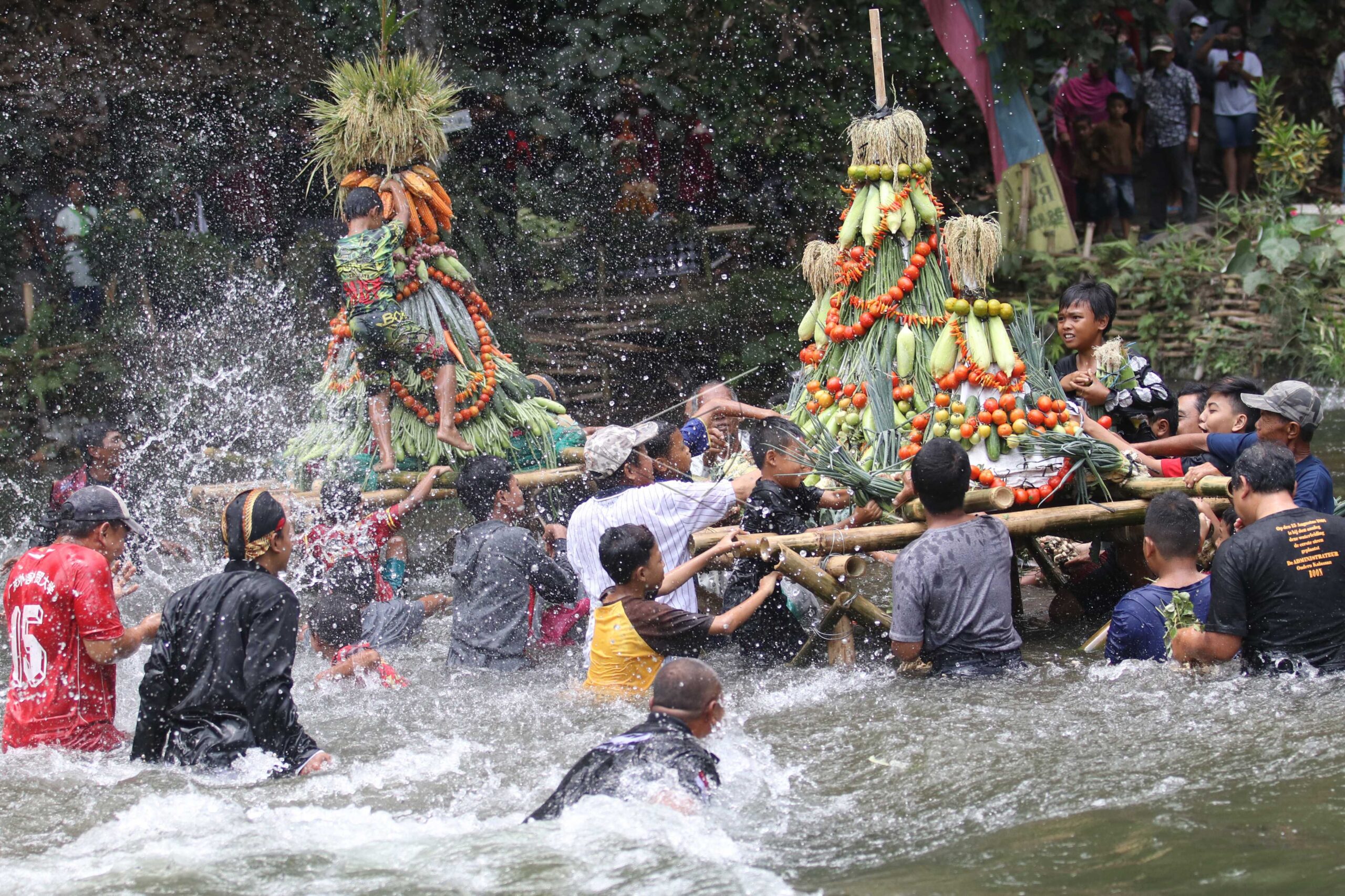 People splash water to each other while scramble the mountains of crops and snacks during Kebur Banyu Ubalan tradition to conserve springs at Ubalan springs tourism spot in Jarak Village, Kediri, East Java, September 29, 2019. ANTARA FOTO/Prasetia Fauzani/ama/dw/nym.