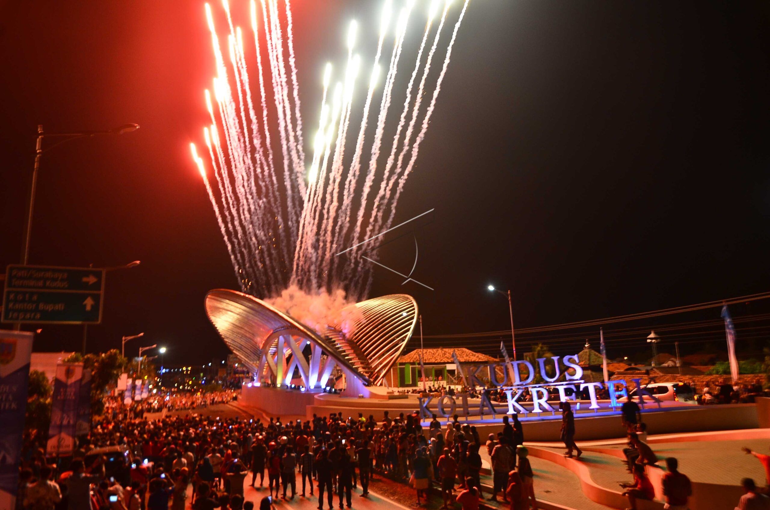 People watch fireworks show during the inauguration of Kudus City of Kretek Gate (GKKK) at Tanggul Angin Park in Jati, Kudus, Central Java, April 27, 2016. ANTARA FOTO/Yusuf Nugroho/dw/tom
