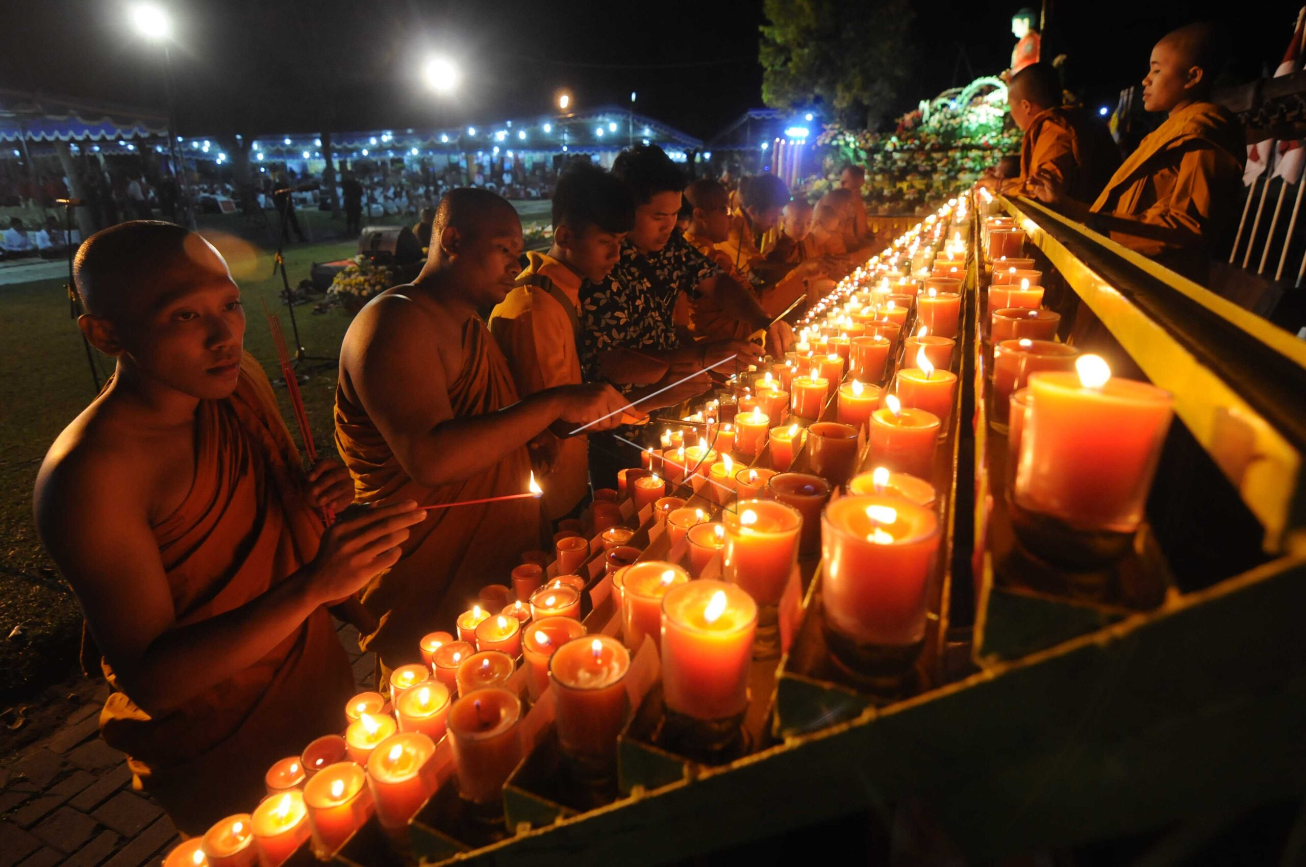 A Buddhist monk lights a candle for the bestowal of services which is a means of praying for ancestral spirits and mankind on earth in a series of Vesak celebrations 2563 BE/2019 at Sewu Temple, Prambanan, Klaten, Central Java, May 18, 2019. ANTARA FOTO/Aloysius Jarot Nugroho/hp/dw/nym.