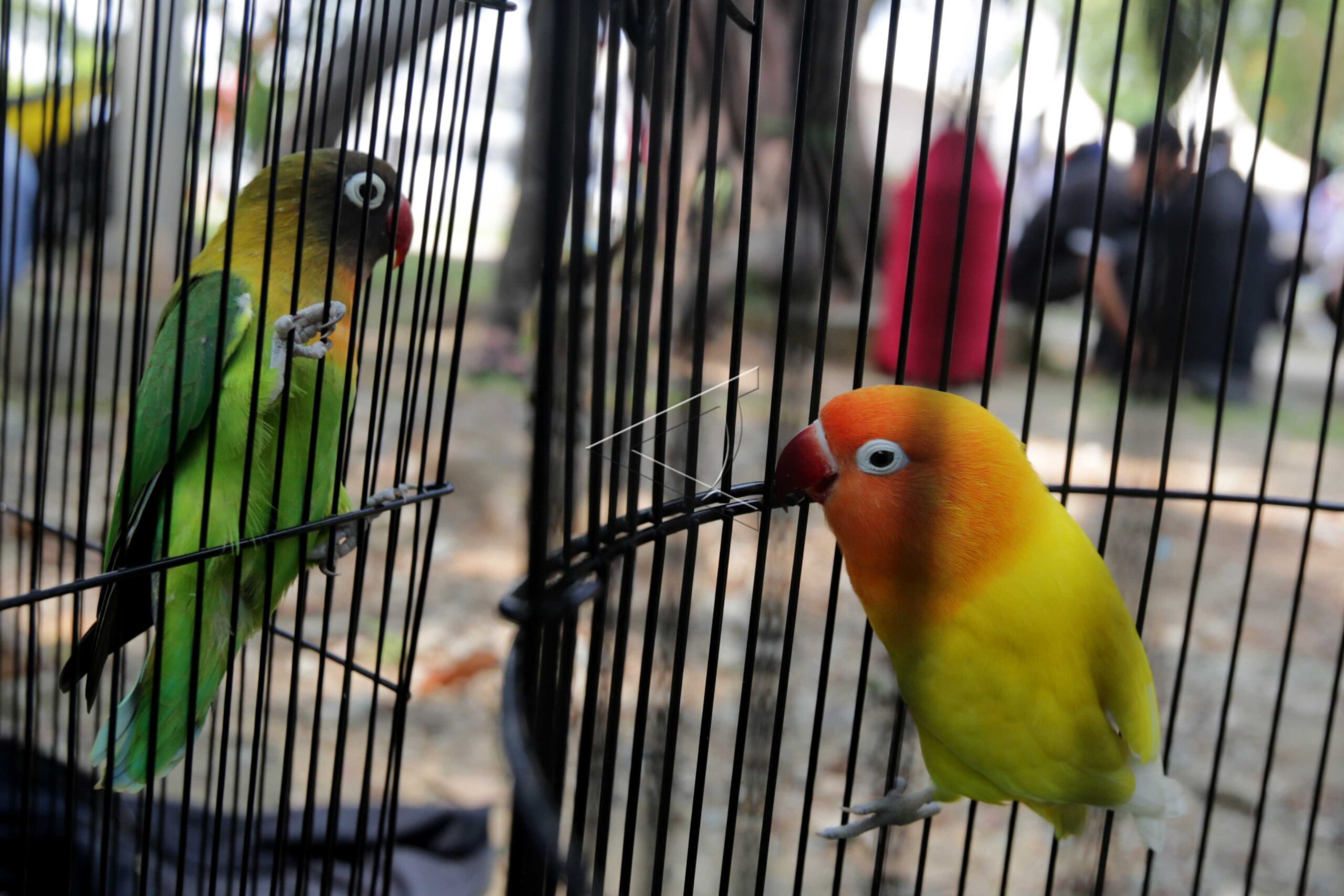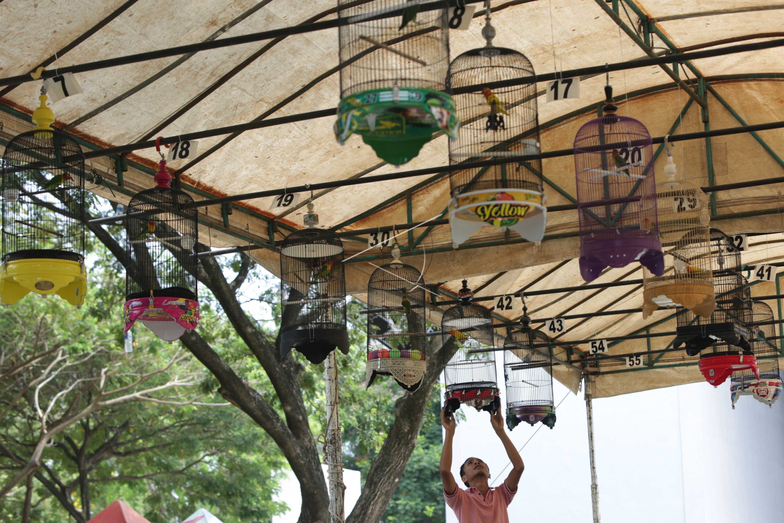 Lovebirds are seen inside cages during chirping bird contest in Banda Aceh, Aceh, March 24, 2019. ANTARA FOTO/Irwansyah Putra/dw/tom.