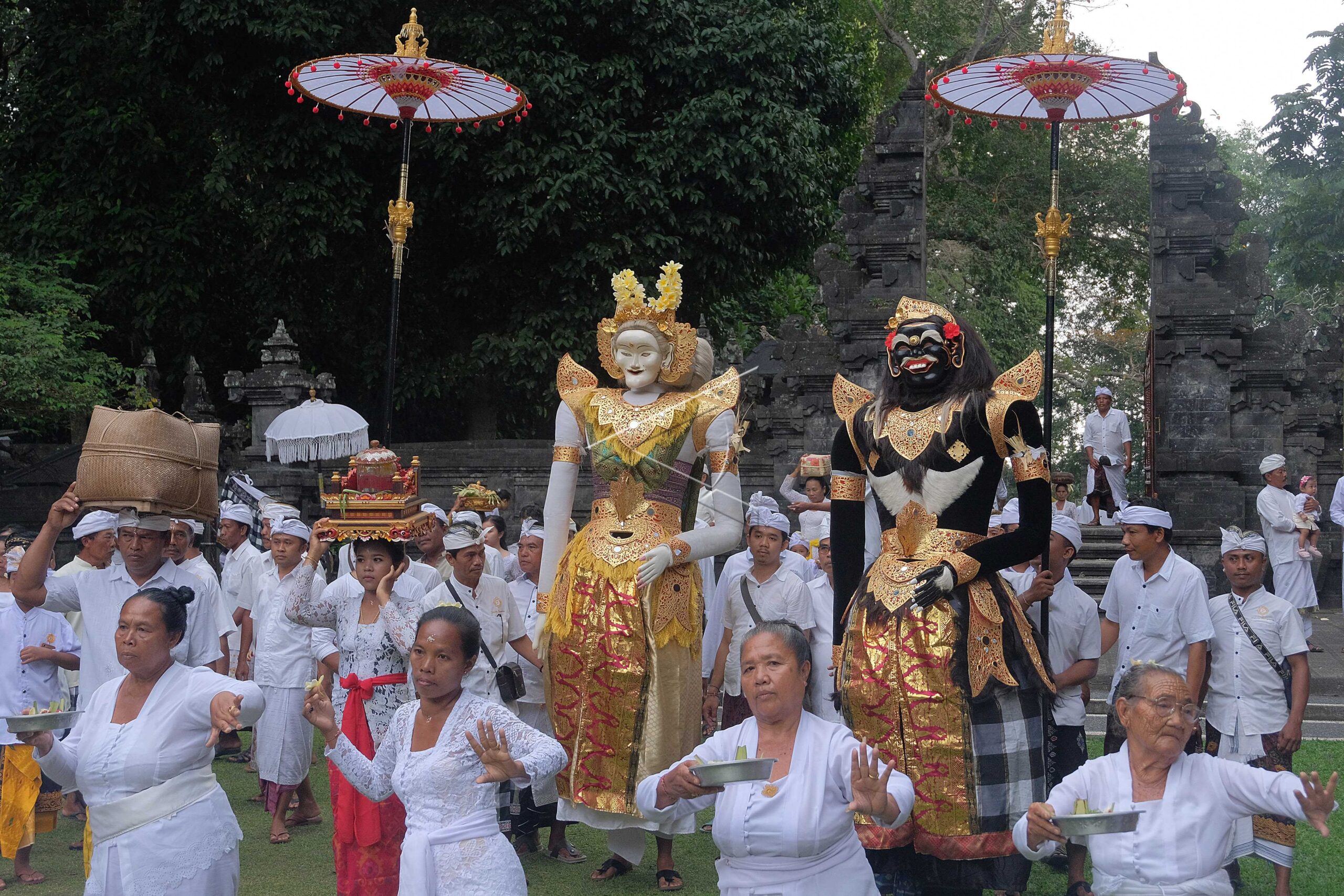 Hindus carry Gebogan or offerings fill with cakes, fruits, flowers, and coconut leaves decoration during the Mapeed tradition at Alas Kedaton Temple, Tabanan, Bali, August 13, 2019. ANTARA FOTO/Nyoman Hendra Wibowo/hp/dw/nym