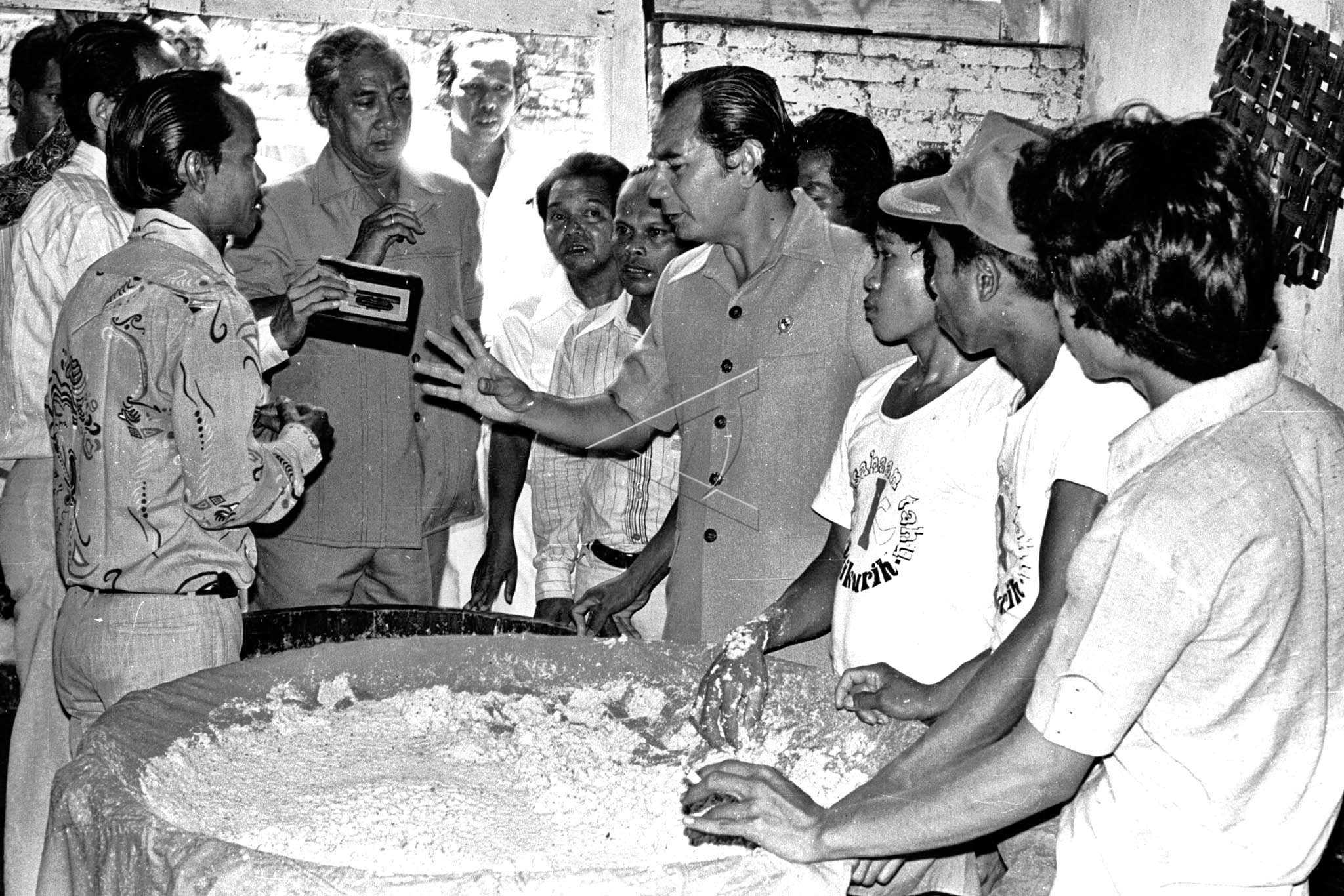 Minister of Development and Environmental Supervision (PPLH) Emil Salim (4th right) accompanied by Governor of Jakarta Tjokropranolo visit tofu factory in Utan Kayu Sub-district, East Jakarta, September 11, 1979. ANTARA FOTO/Ali Anwar/hm/asf/tom.