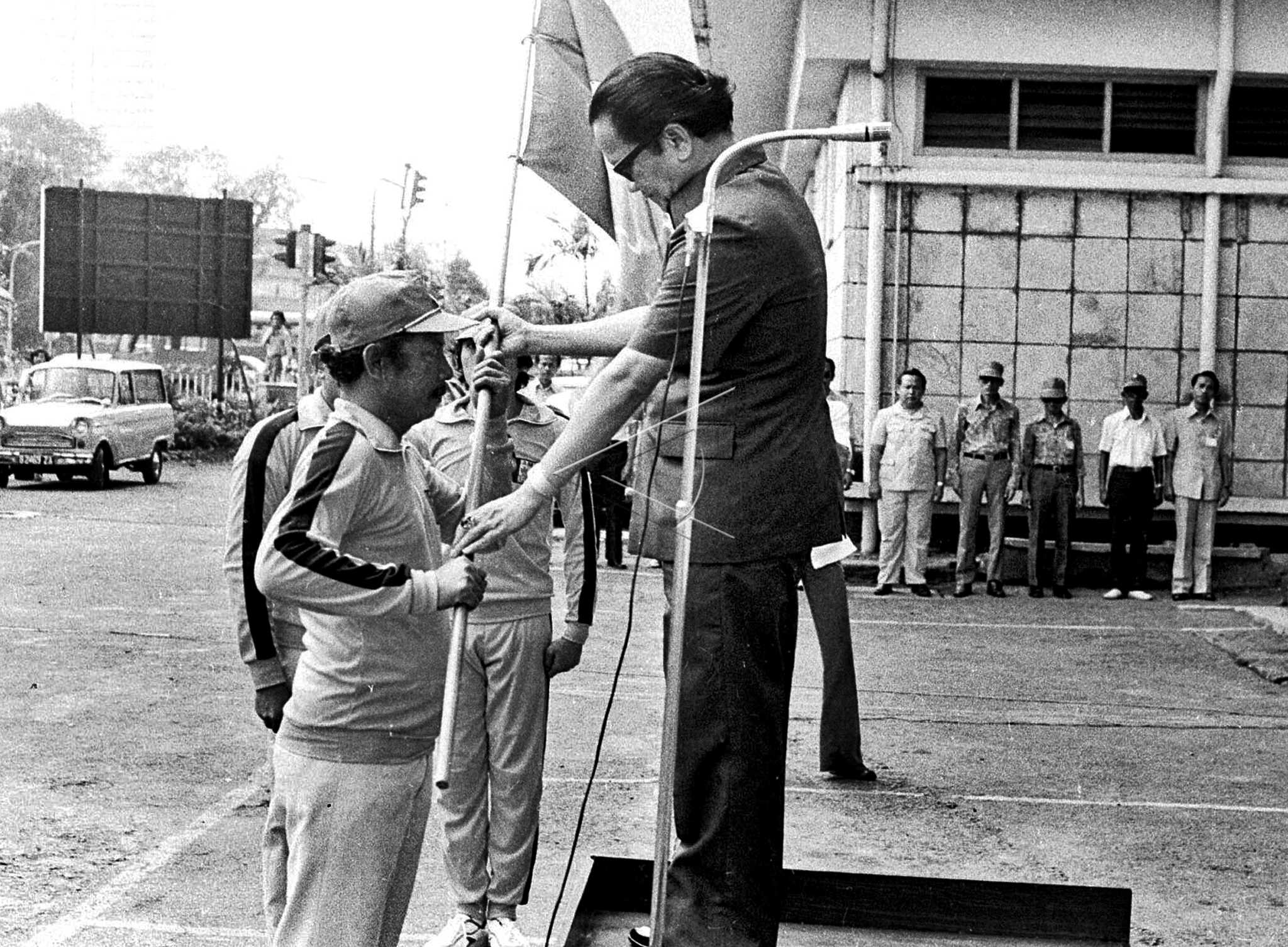 Minister of Religion Alamsjah Ratu Prawiranegara sees the departure of the 10th Persada Contingent at Ministry of Religion in Jakarta (1978). ANTARA FOTO/Sukendi/hm/asf/tom.