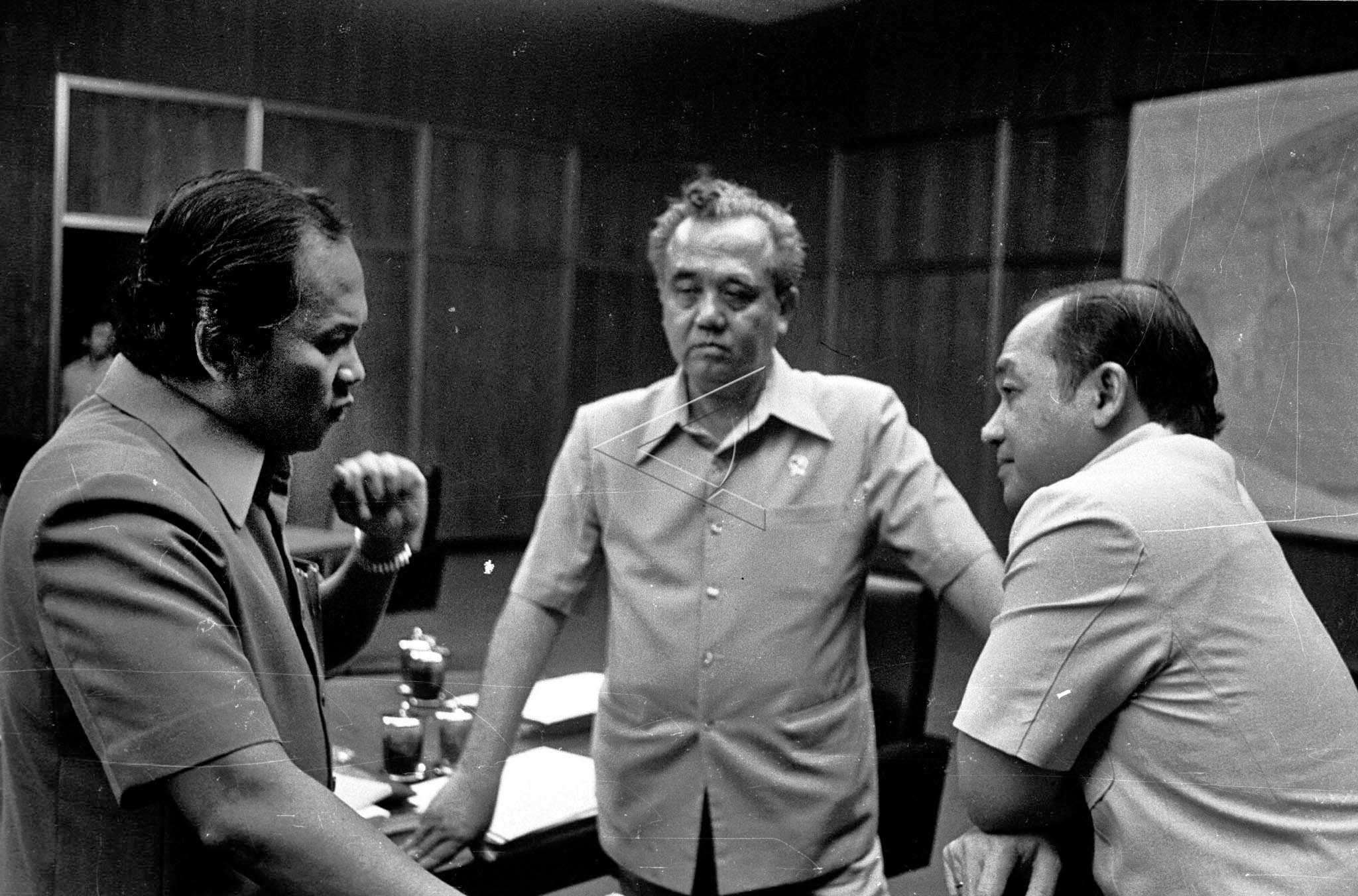 Minister of Research and Technology BJ Habibie talks to Minister of Transmigration Martono and Minister of Public Works Purnomosidi before attending a meeting of economy, finance and industry lead by President Soeharto in Jakarta, 1978. ANTARA FOTO/Rachman/hm/asf/tom.