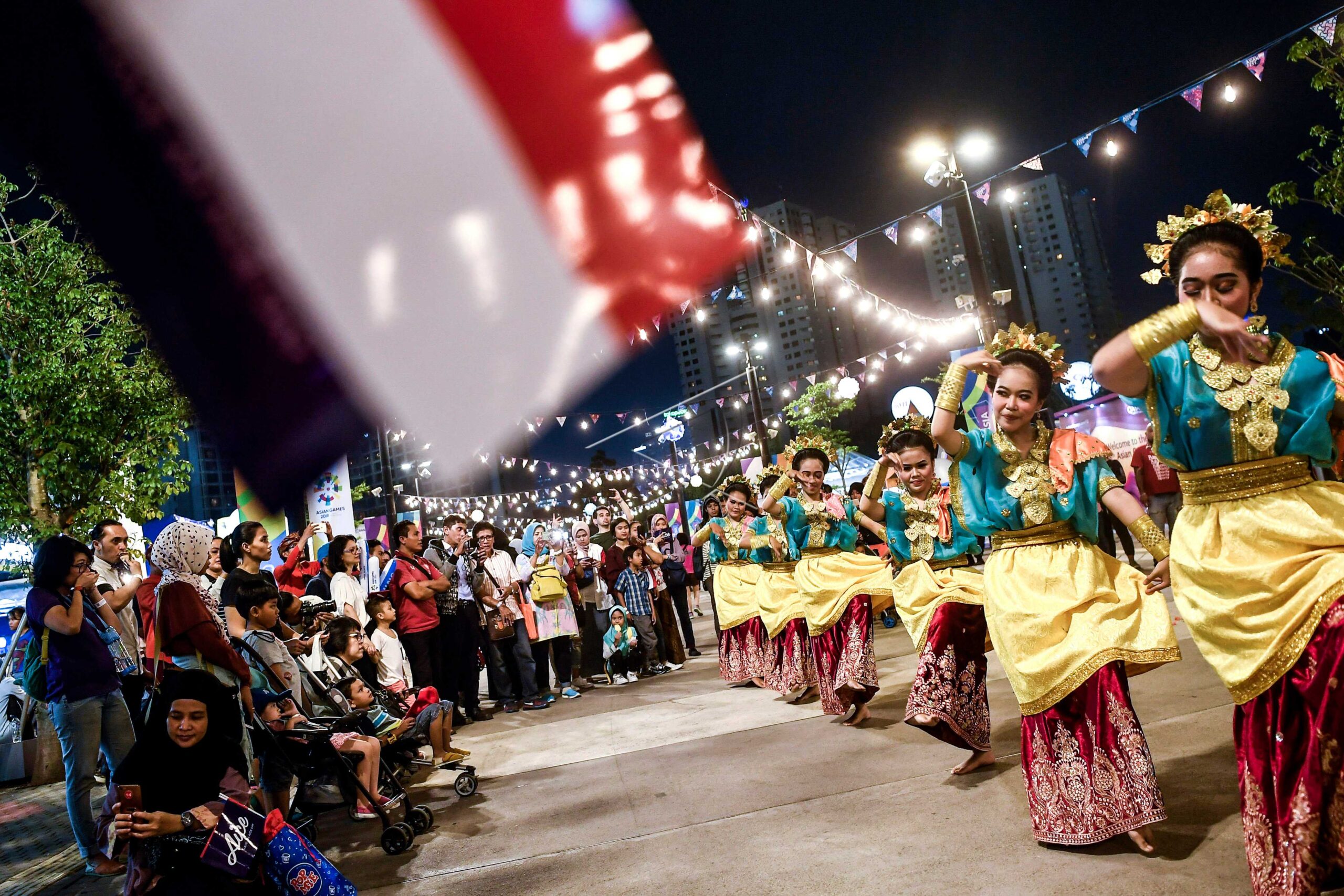 Sanggar Bumi Gora dancers perform Nuri dance originally from Sumbawa during Asian Games 2018 at Zona Kaka in Gelora Bung Karno Stadium Complex, Jakarta, August 27, 2018. ANTARA FOTO/Sigid Kurniawan/ama/dw/wpa.