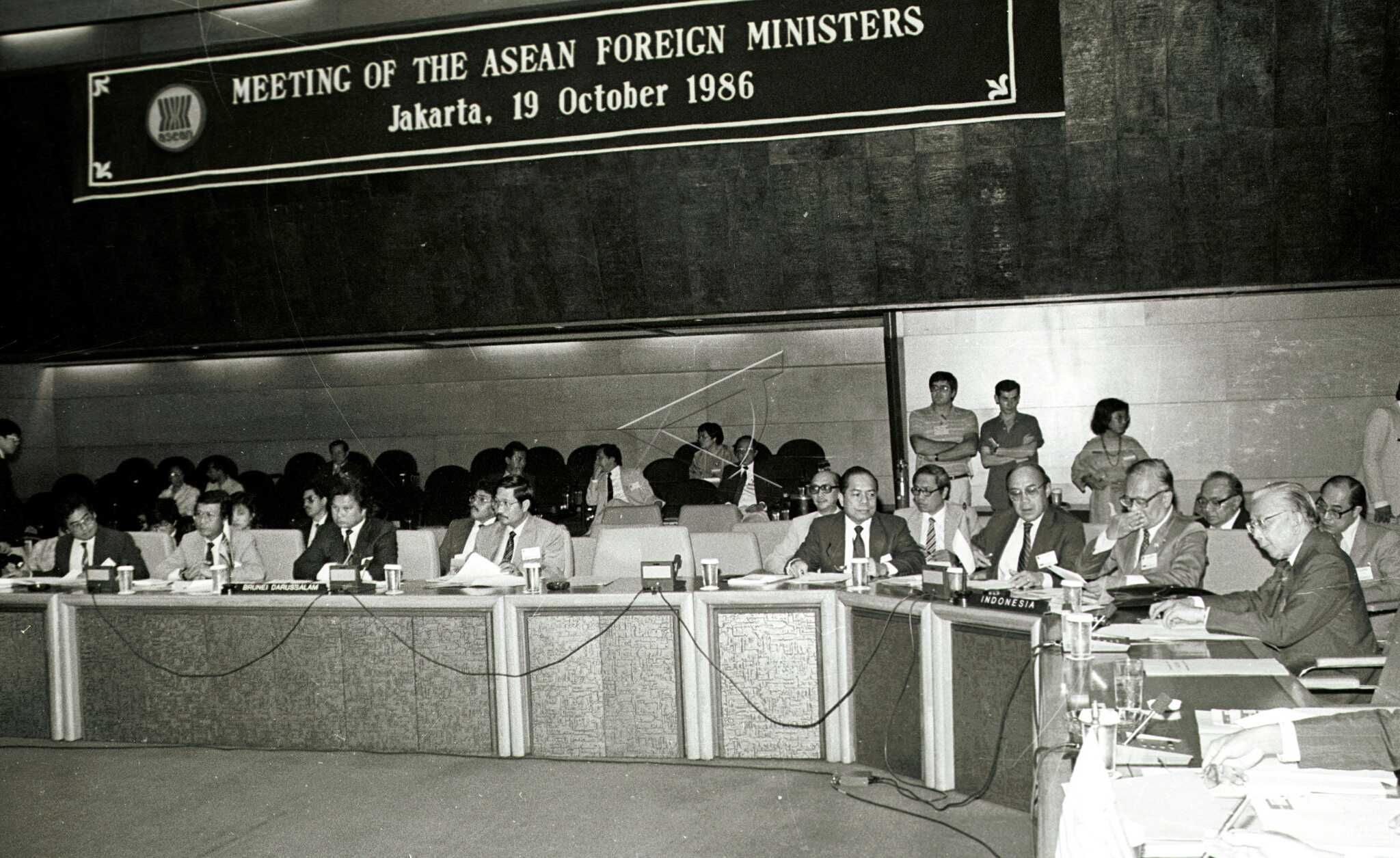 Minister of Foreign Affairs Mochtar Kusumaatmadja (second right) chaired the ASEAN Foreign Ministers Meeting to discuss preparations for the 6th ASEAN Foreign Ministers meeting in 1986 which was planned to be opened on October 20 at State Palace by President Soeharto, at ASEAN Secretariat Building, Jakarta, October 19, 1986. ANTARA FOTO/N03/N04/asf/nym/sa.