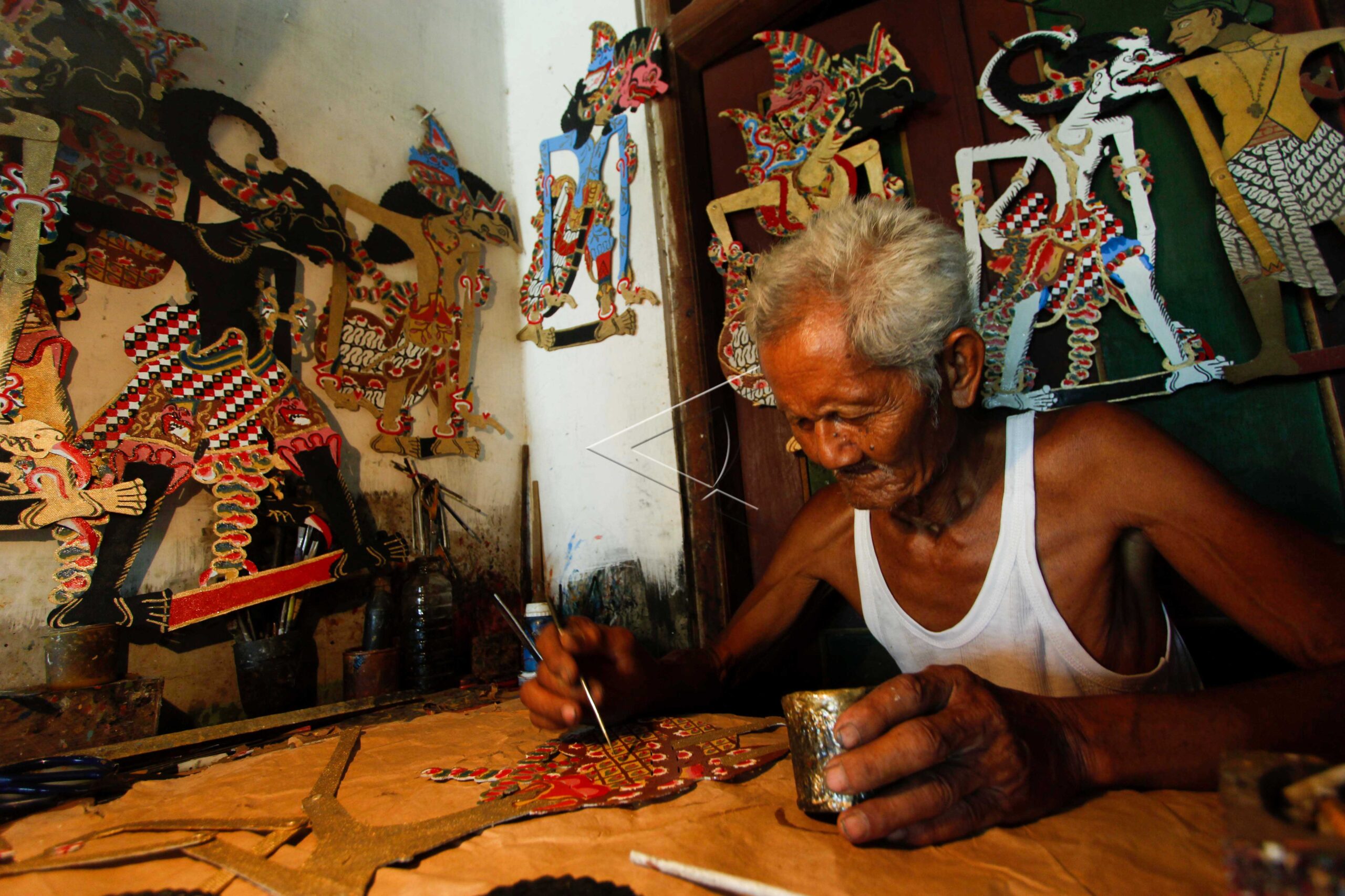 Mertowirejo (75) paints paper puppets using oil paint in Gondegan, Sukoharjo, Central Java, May 10, 2013. FOTO ANTARA/Herka Yanis Pangaribowo/dw/tom/sa.