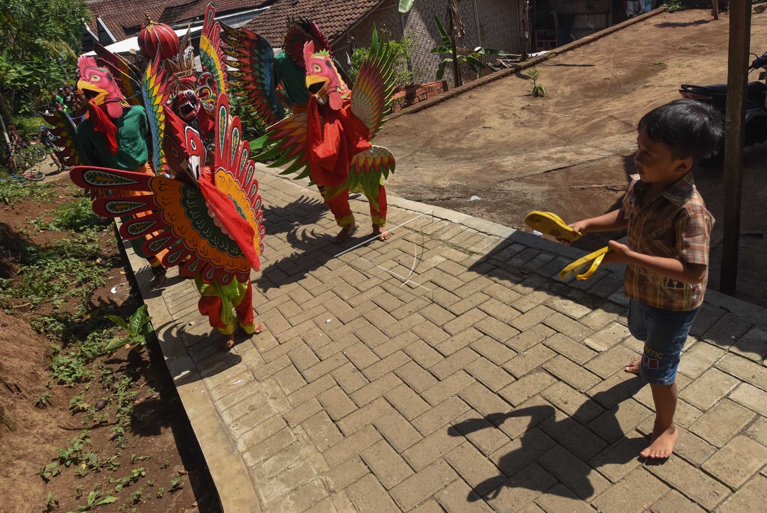 Children perform Pitik-Pitikan dance which is a traditional dance of Banyuwangi Osing Tribe at Kemiran Village, Banyuwangi, East Java, January 10, 2016. ANTARA FOTO/Zabur Karuru/ama/dw/nym.