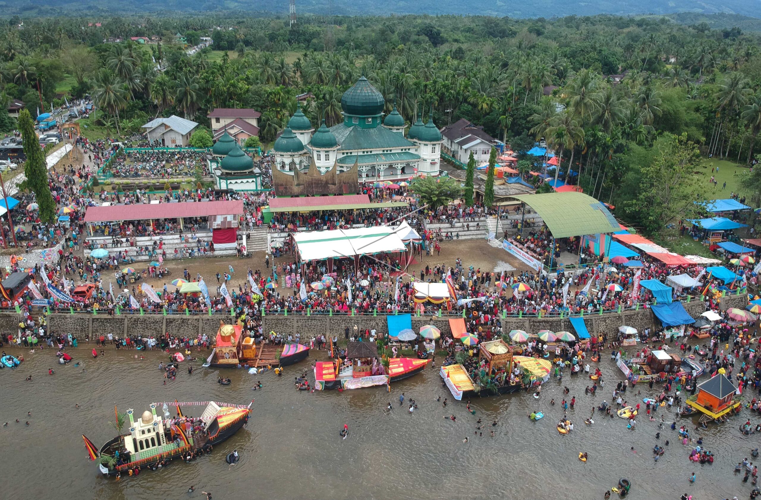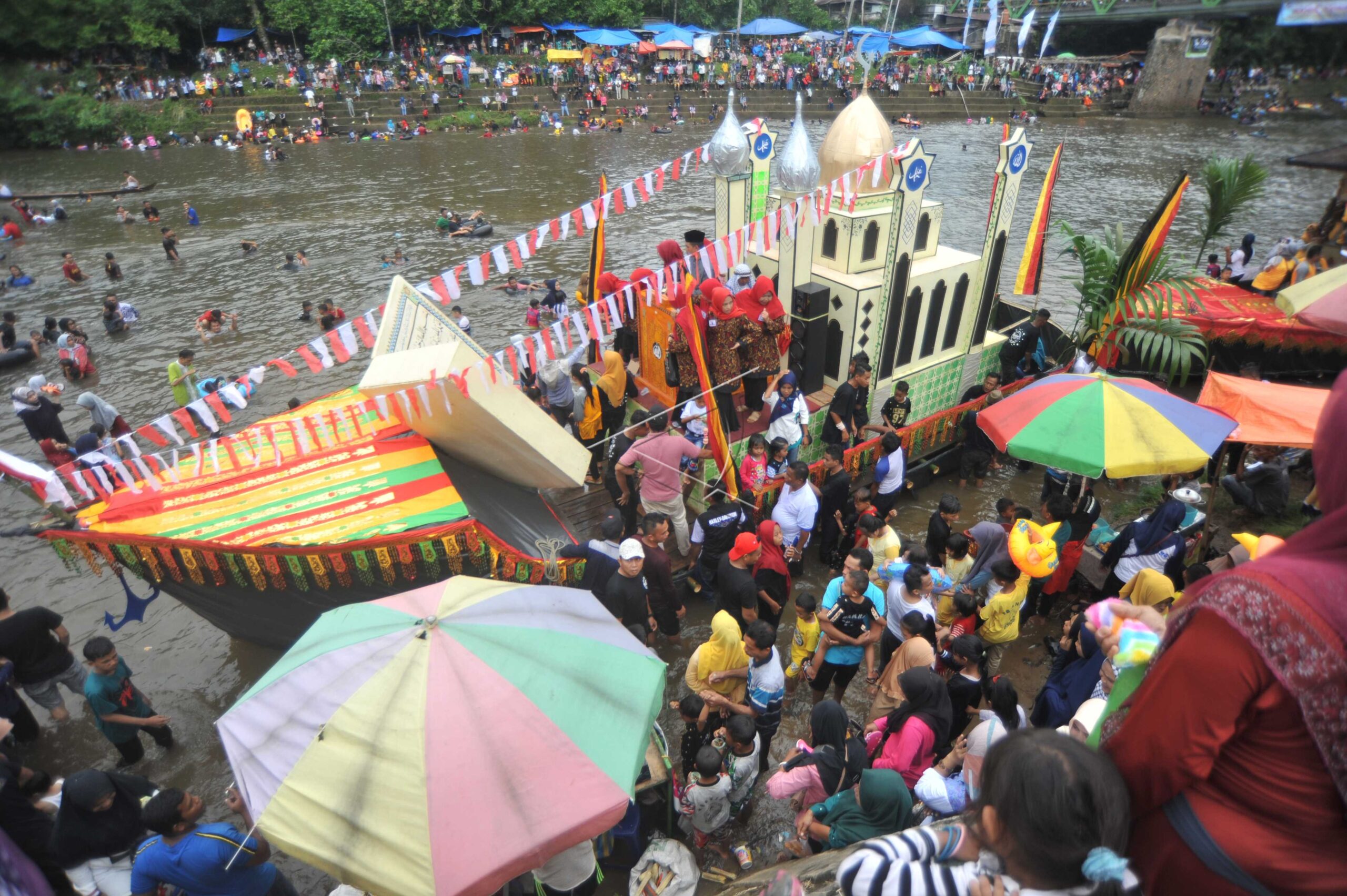 Residents prepare a decorative boat in the form of a mosque pulpit or “Mimbau” in the Potang Balimau tradition which means bathing with limau (lime) water to purify themselves before the month of Ramadan 1440 H on the Batang Mahek River, Pangkalan, Limapuluhkota Regency, West Sumatra, May 5, 2019. ANTARA FOTO/Iggoy el Fitra/aww/dw/nym.