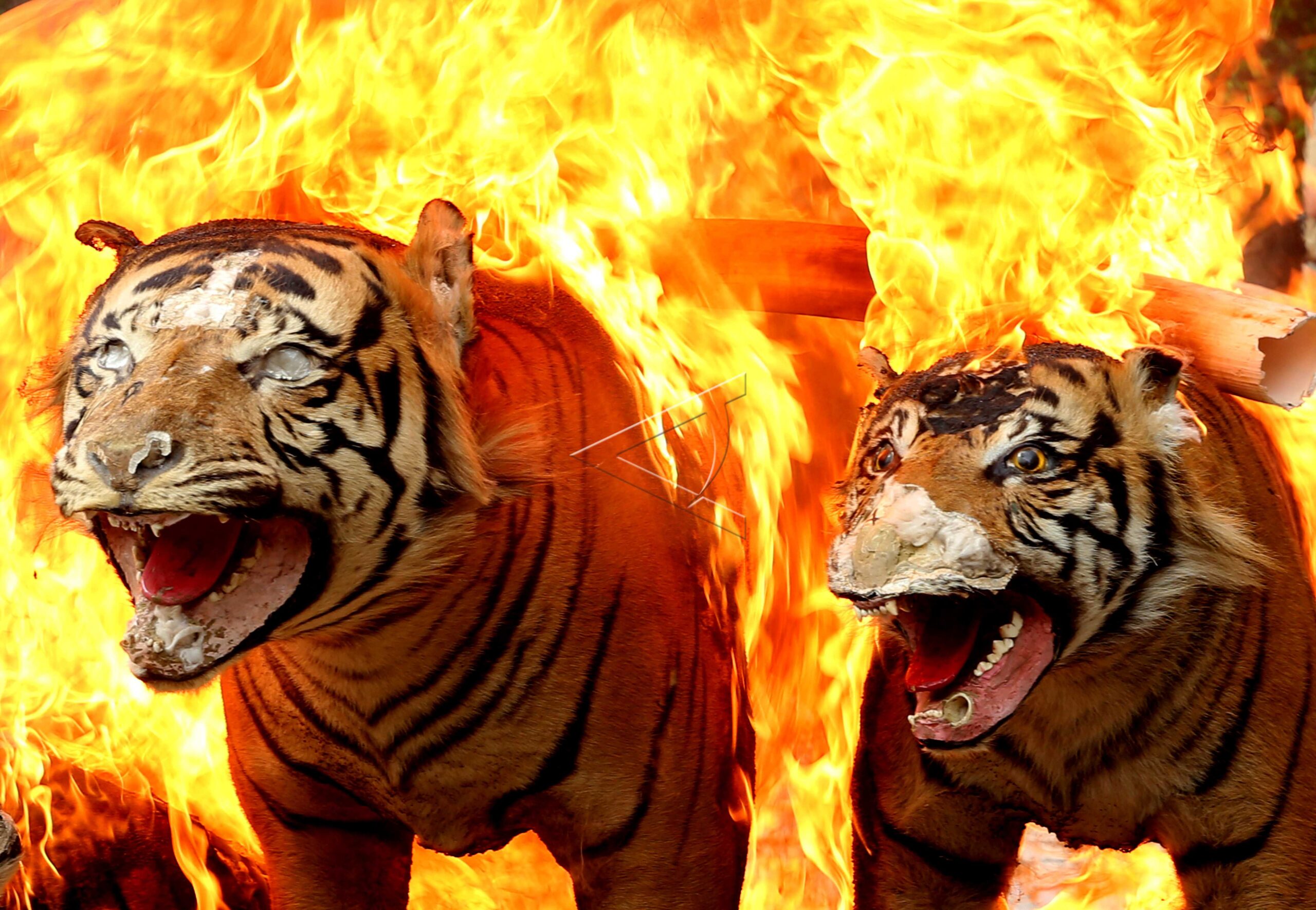 Two preserved Sumatran tigers (Panthera tigris sumatrae) seized from residents are being burned at the front yard of Aceh Forestry Department in Banda Aceh, Aceh, May 23, 2016. ANTARA FOTO/Irwansyah Putra/dw/tom.